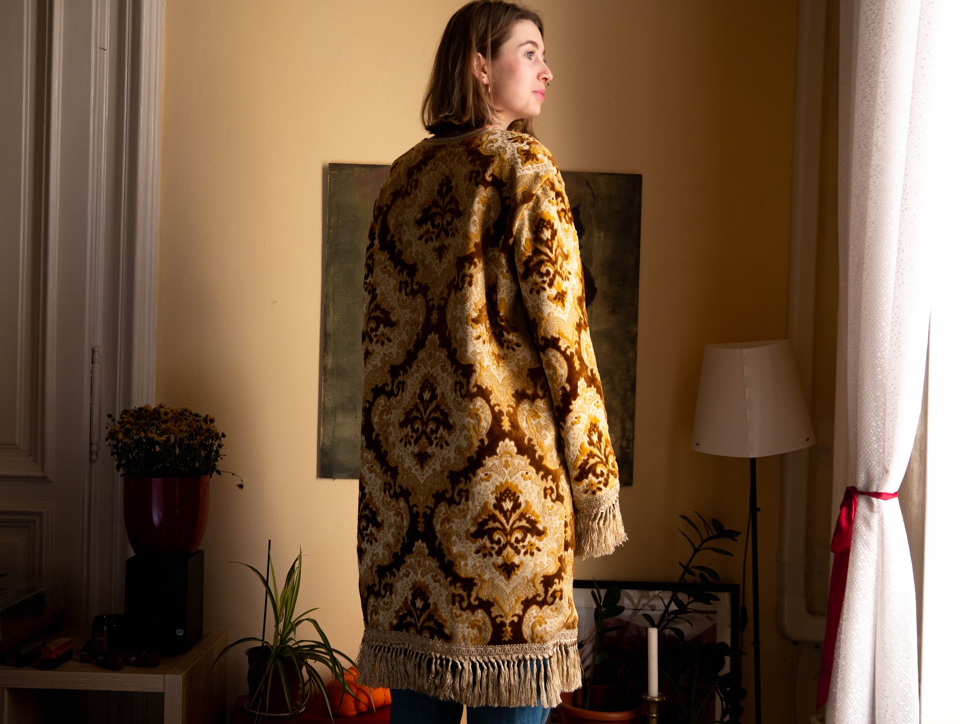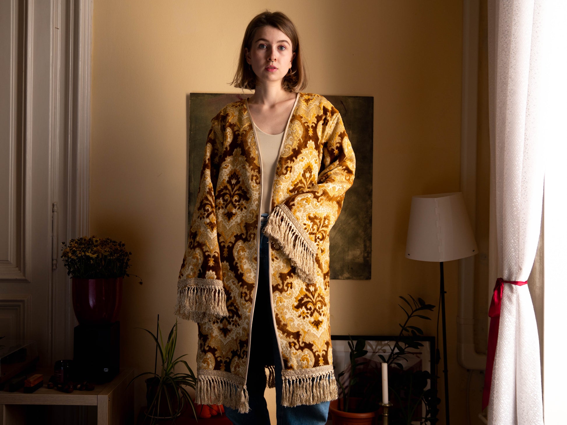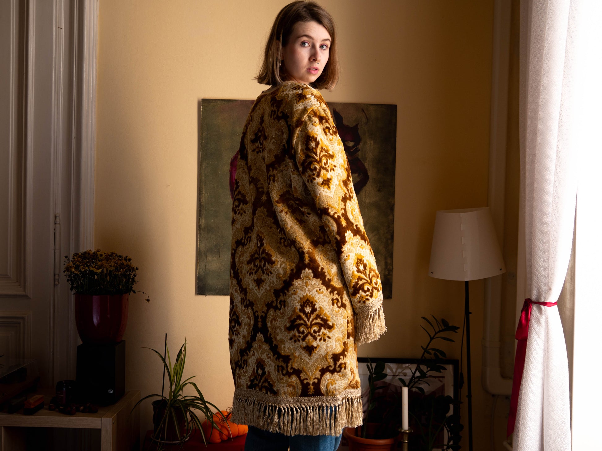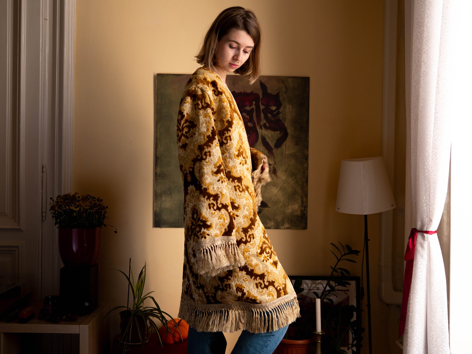 Ágytakaróból készült egyedi kabát, ami kényelmes, stílusos, meleg és puha is egyben. Ideális lehet egy egyszerű szett feldobásához, de extrább darabokkal is kombinálható.