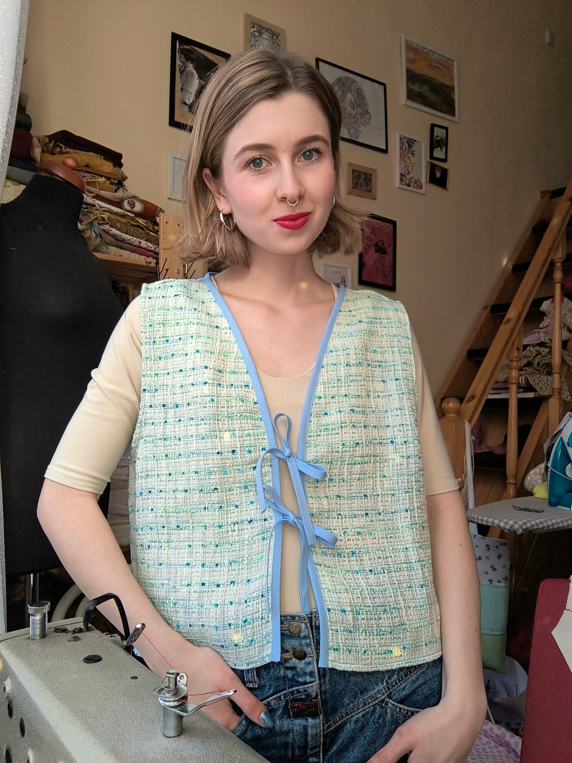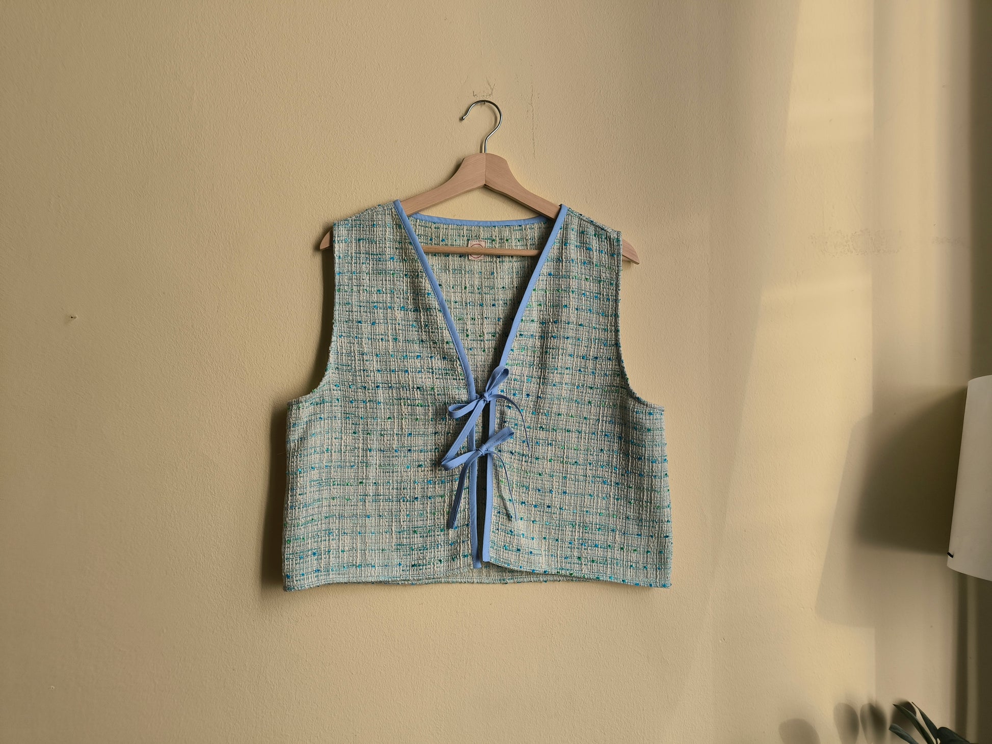 Szabászati maradékból készült, ujjatlan, masnis megkötős blúz, amely egyben mellényként is viselhető. Tökéletes választás egy egyszerű szett feldobásához, laza szabásának köszönhetően pedig igazán kényelmes darab.