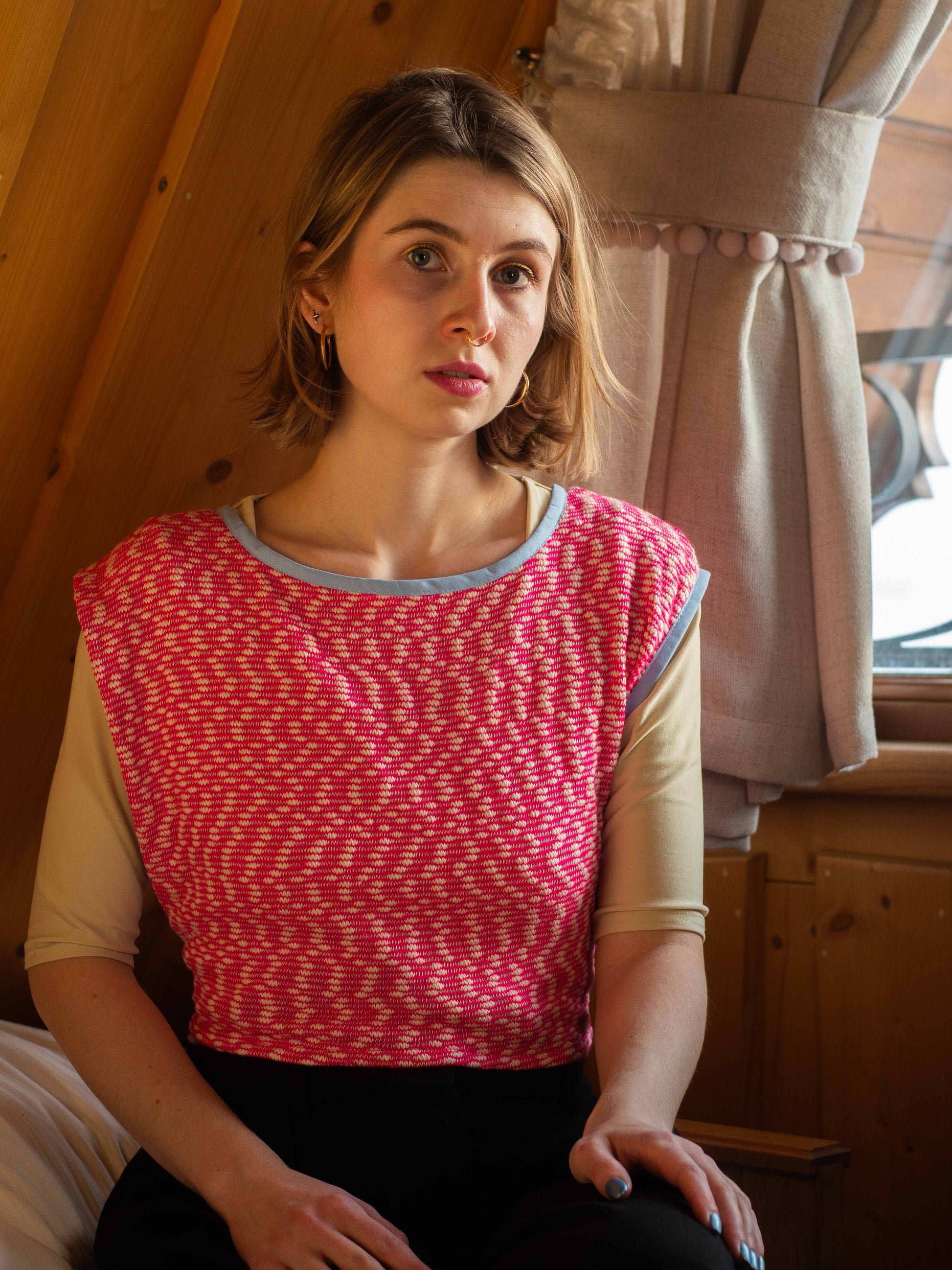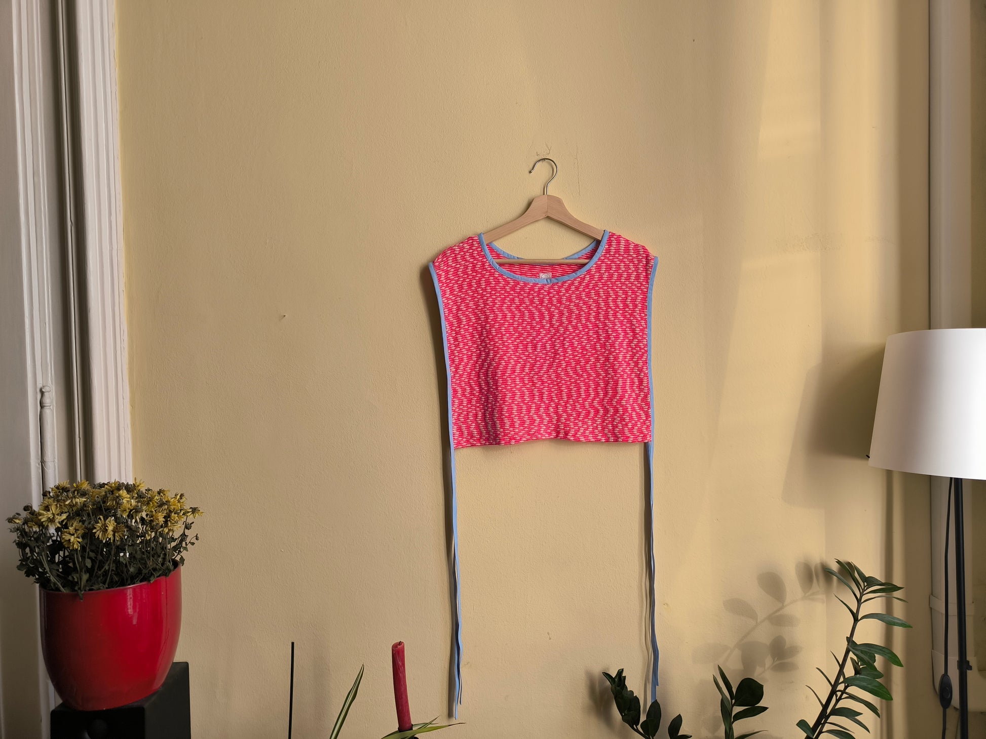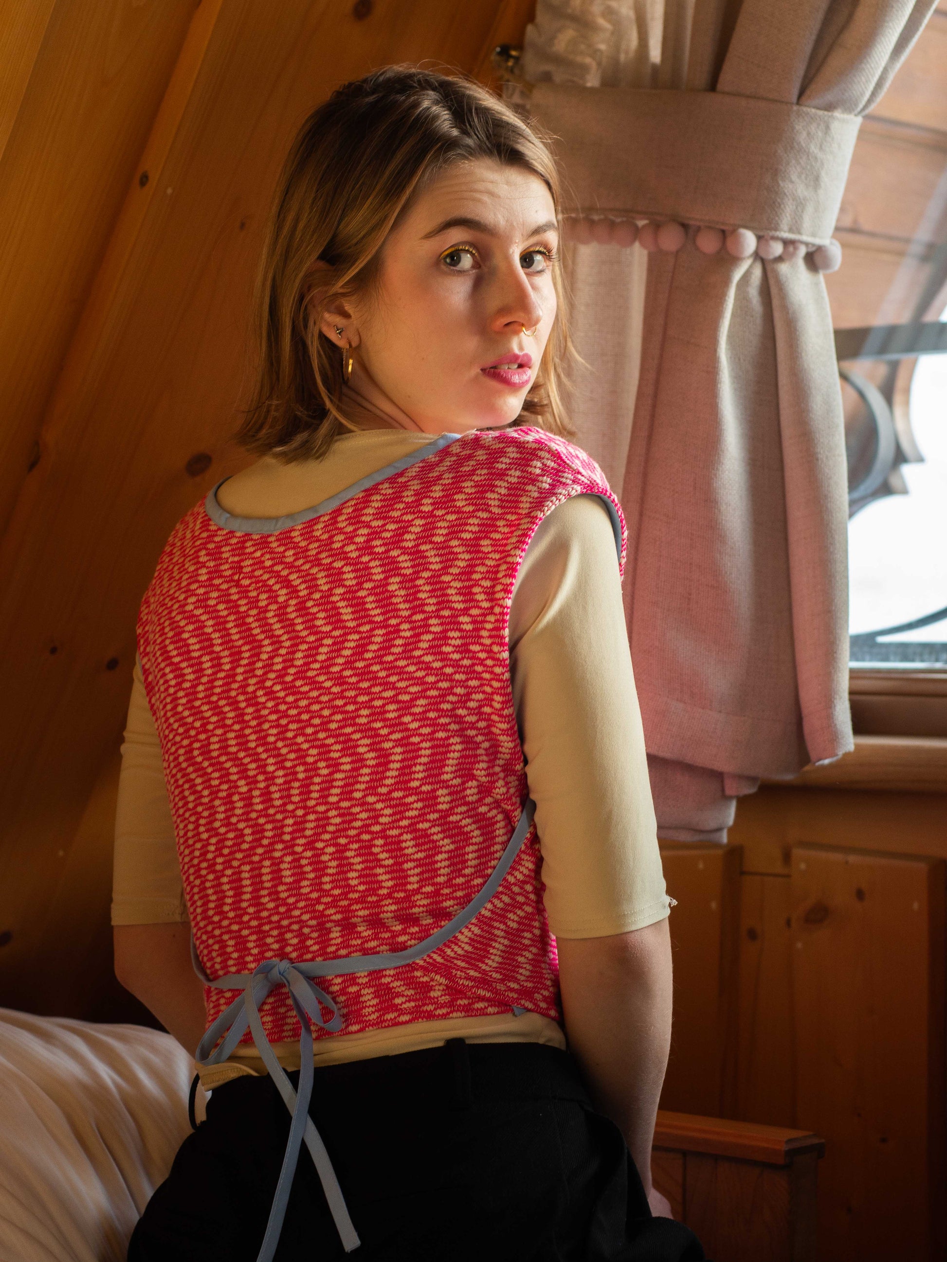 Ez az ujjatlan, megkötős mellény szabászati hulladékból készült, így egyszerre stílusos és környezettudatos választás. Tökéletes kiegészítő egyszerű, hétköznapi szettek feldobásához: viselheted pólóval, inggel, vagy akár téli rétegezéshez is, amikor egy extra melegítő réteg különösen jól jön.
