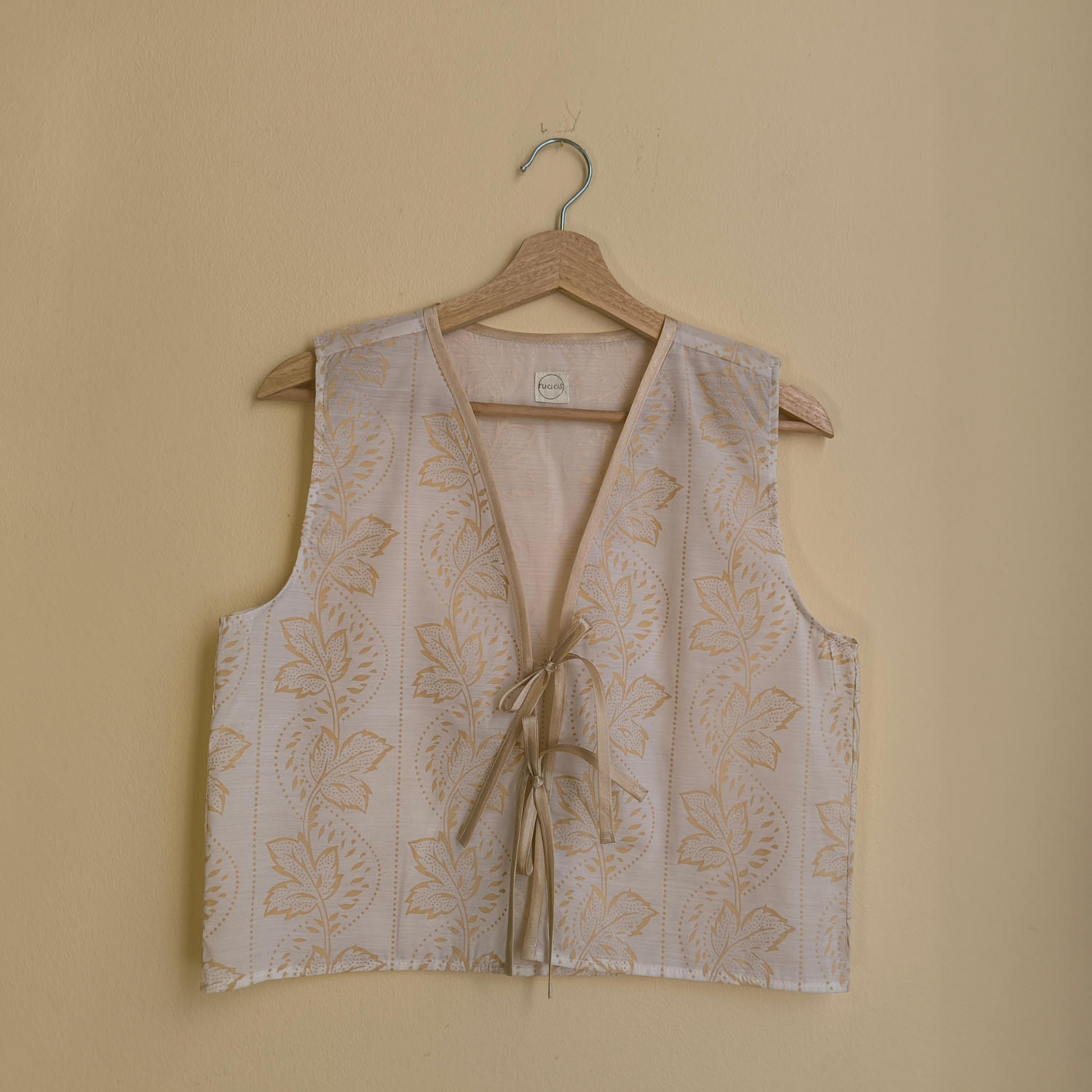 Terítőből készült, ujjatlan, masnis megkötős blúz. Laza szabásának köszönhetően könnyed és jól szellőzik, akár mellényként is hordható.