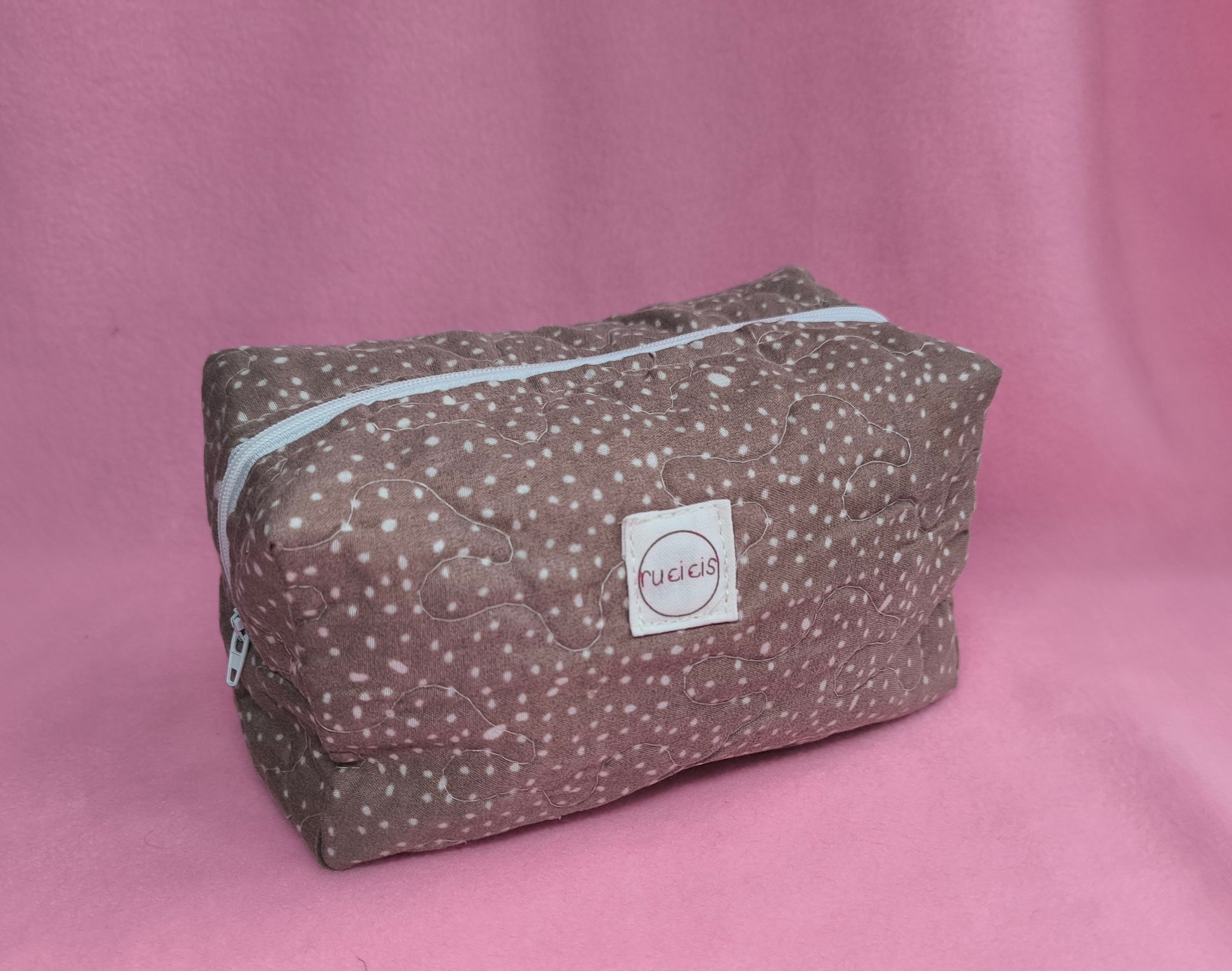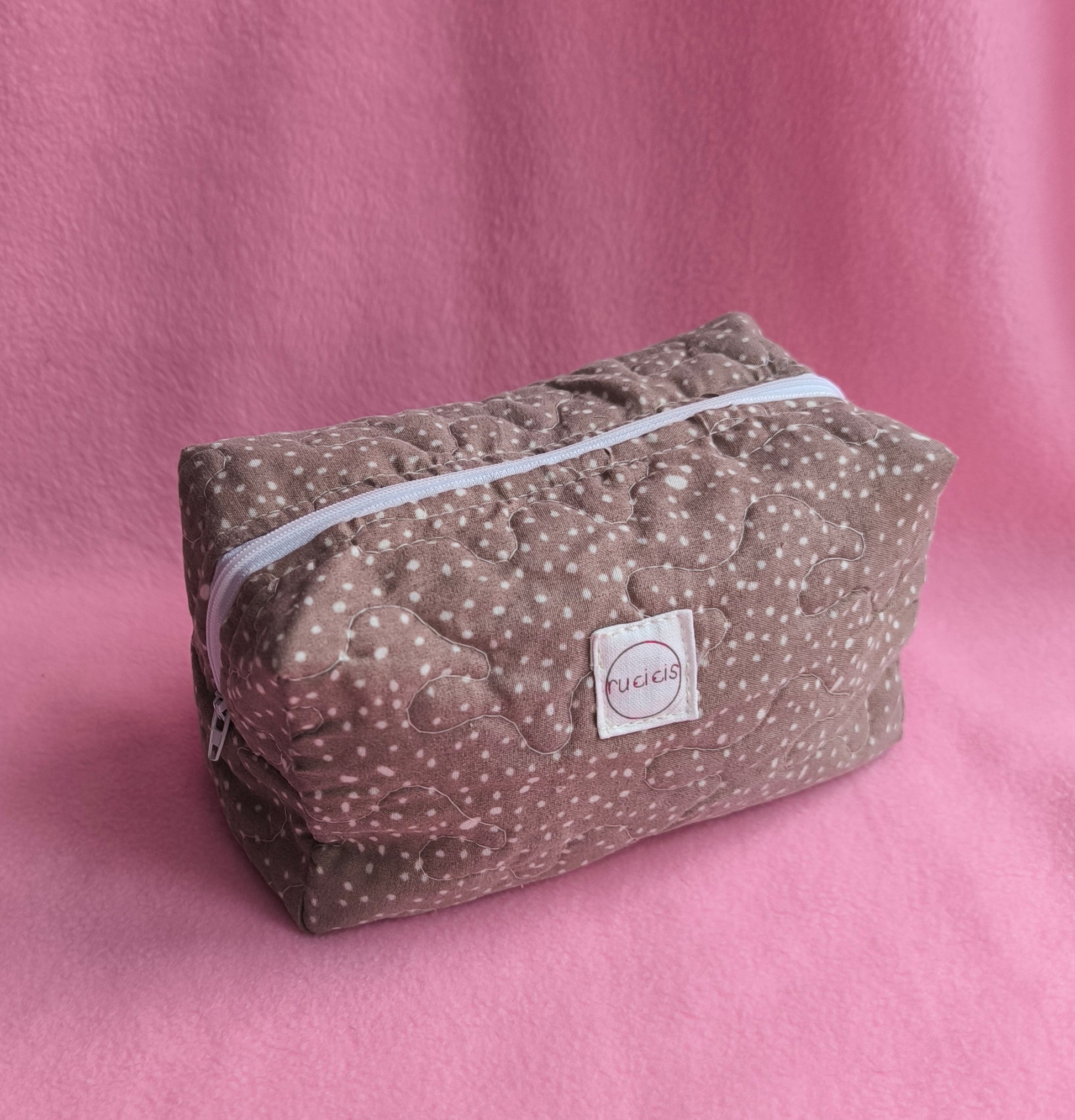 Ez a neszeszer steppelt ágytakaróból készült, pamut vászon béléssel és vidám, színes cipzárral. Praktikus társ a mindennapokban: elfér benne smink, apró kozmetikumok, vagy éppen azok a kis dolgok, amik mindig elkeverednek a táskában.