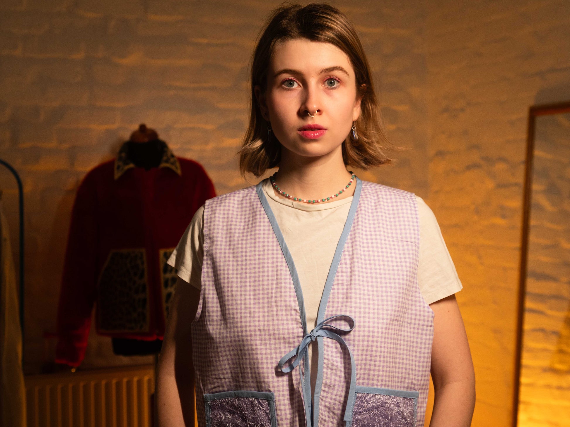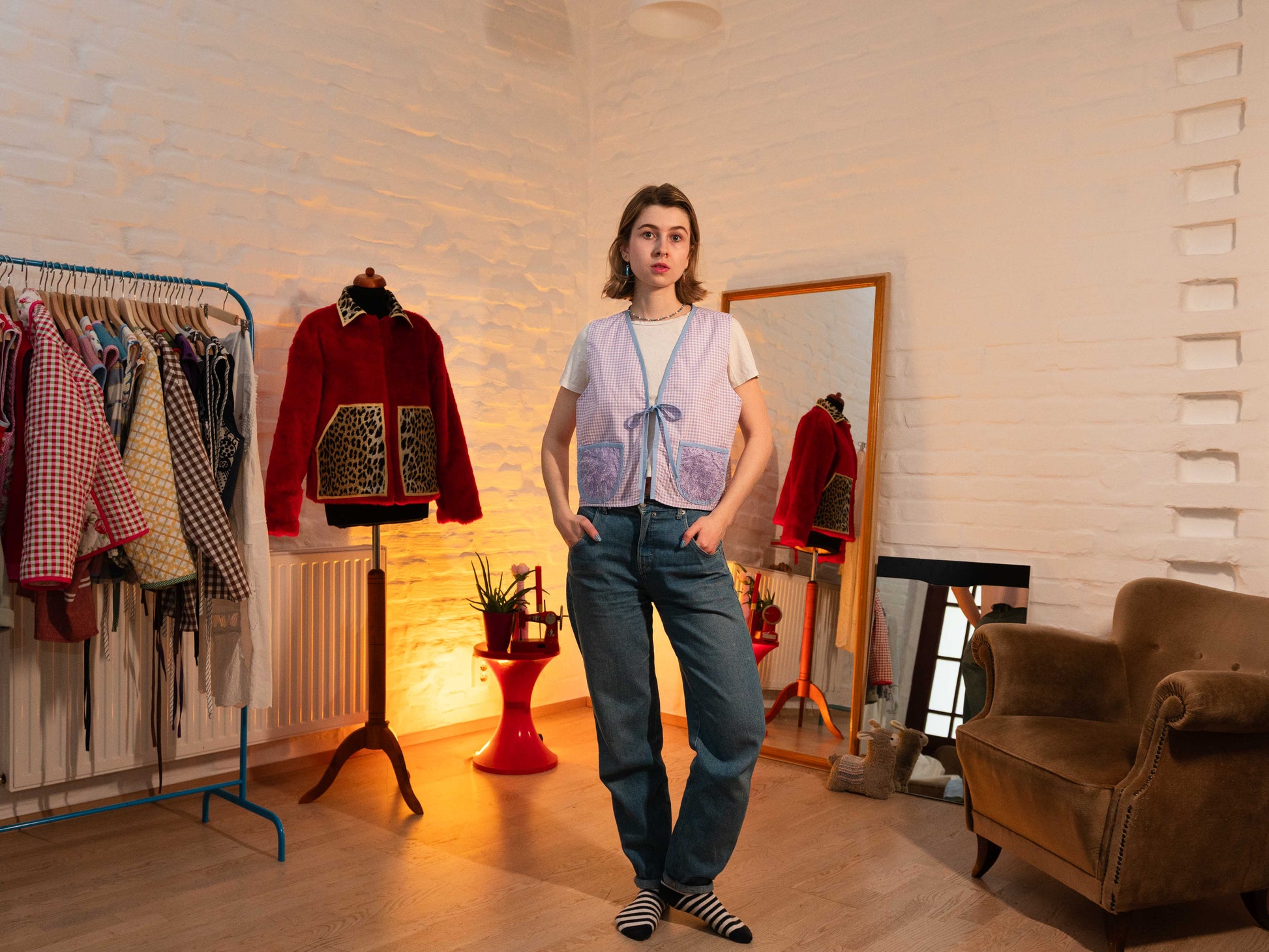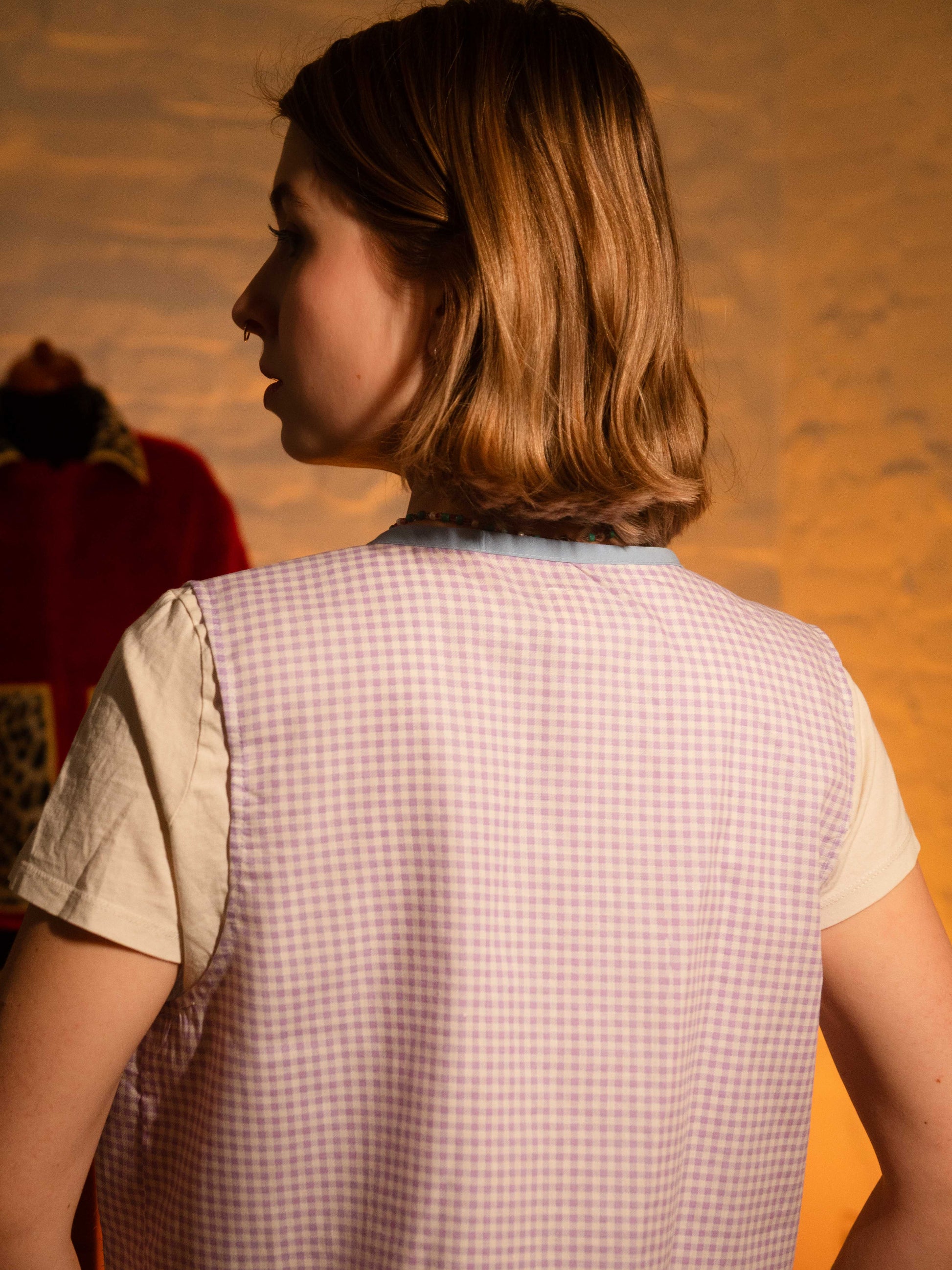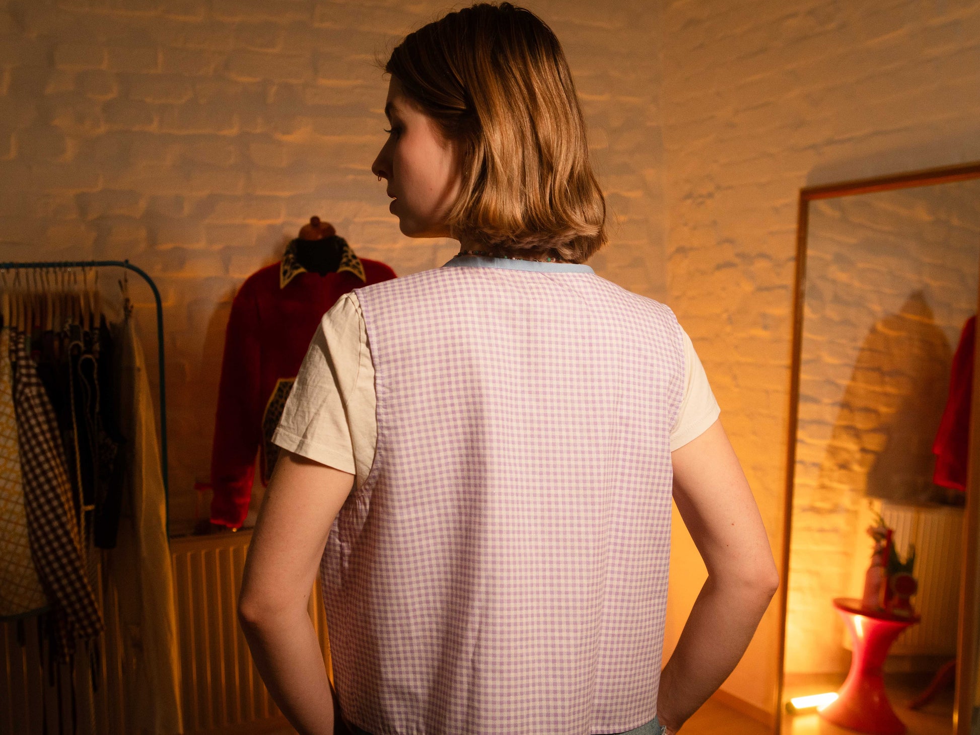 Pamut ágyneműhuzatból és szabászati maradékból készült, ujjatlan, masnis megkötős mellény zsebekkel. Tökéletes választás egy egyszerű szett feldobásához, laza szabásának köszönhetően pedig igazán kényelmes darab.
