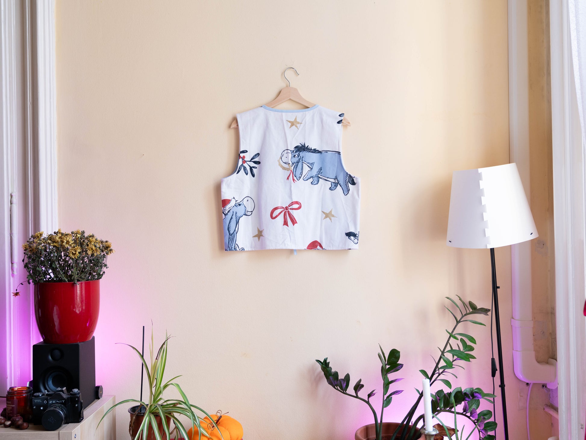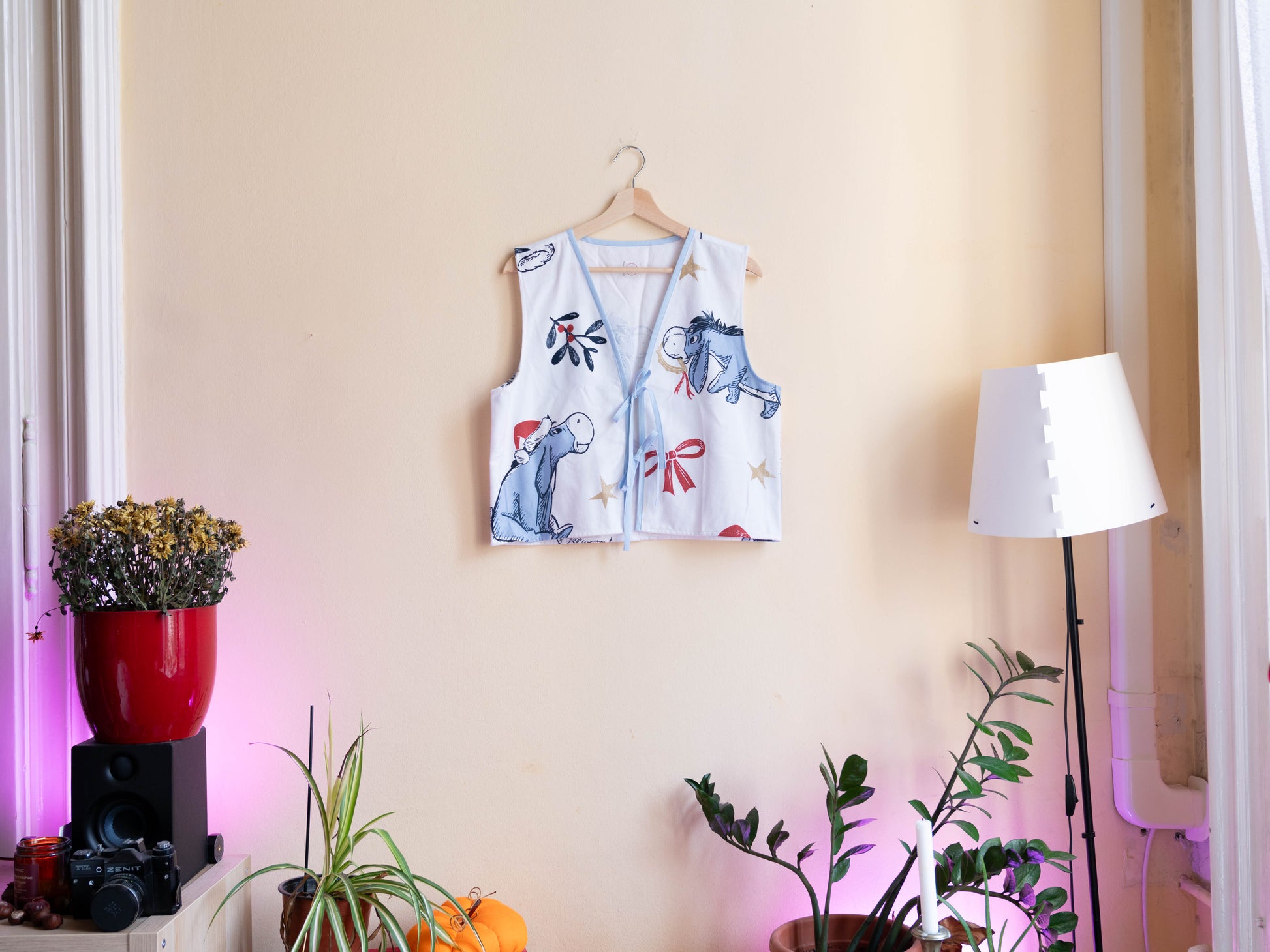 Ágyneműhuzatból készült, ujjatlan, masnis megkötős blúz. Laza szabásának köszönhetően könnyed és jól szellőzik, akár mellényként is hordható.