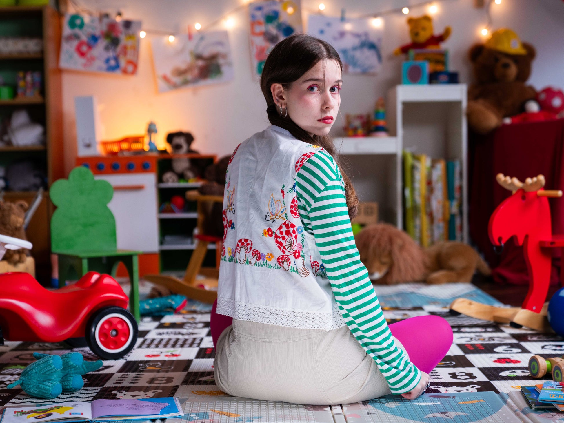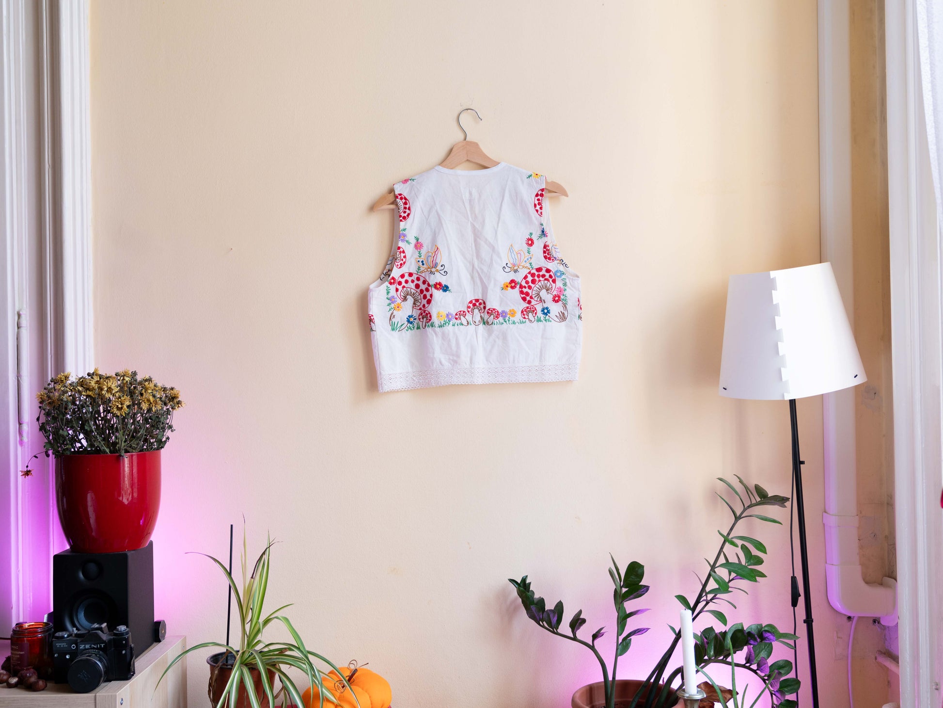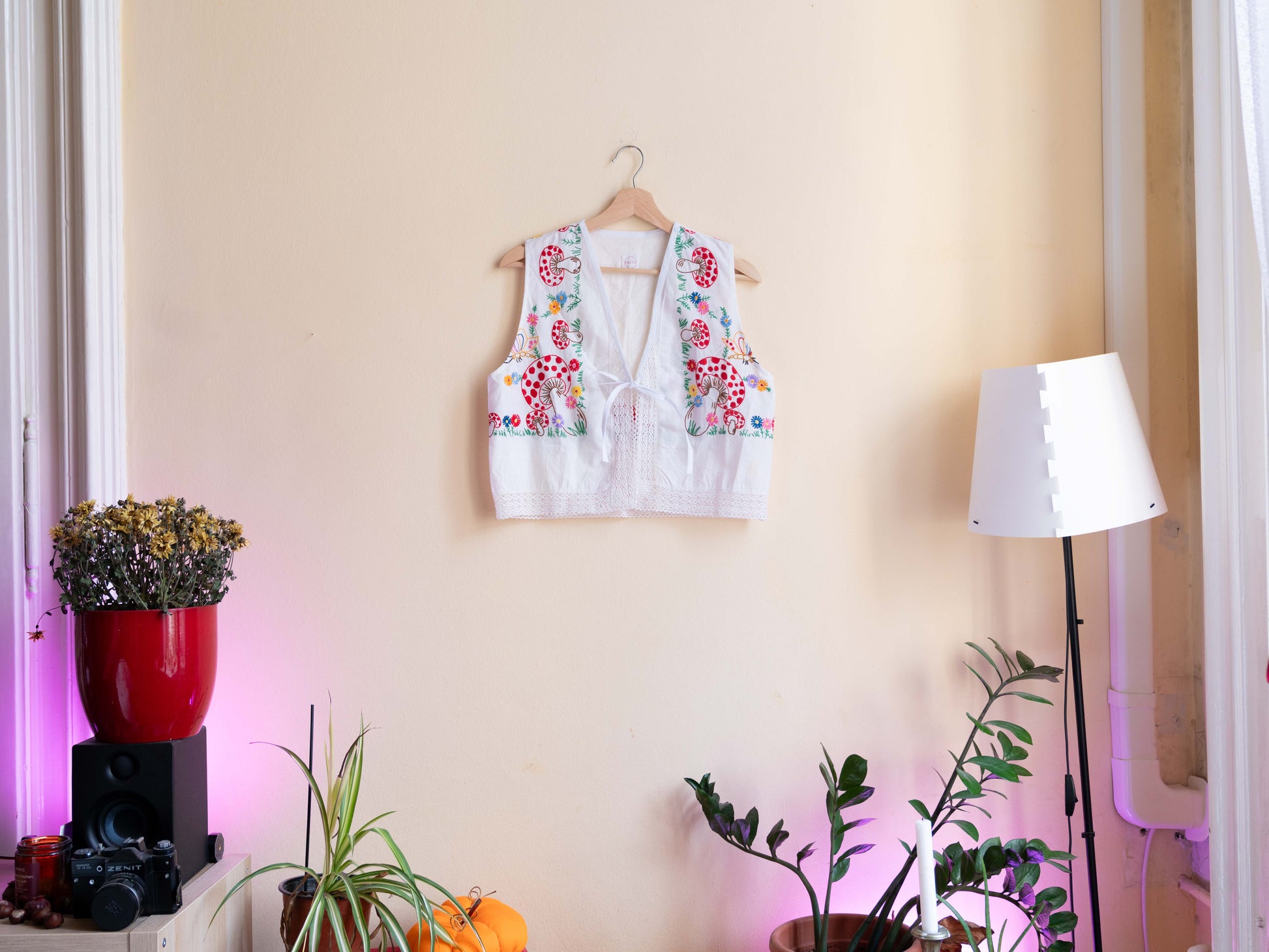 Terítőből készült, ujjatlan, masnis megkötős blúz. Laza szabásának köszönhetően könnyed és jól szellőzik, akár mellényként is hordható.