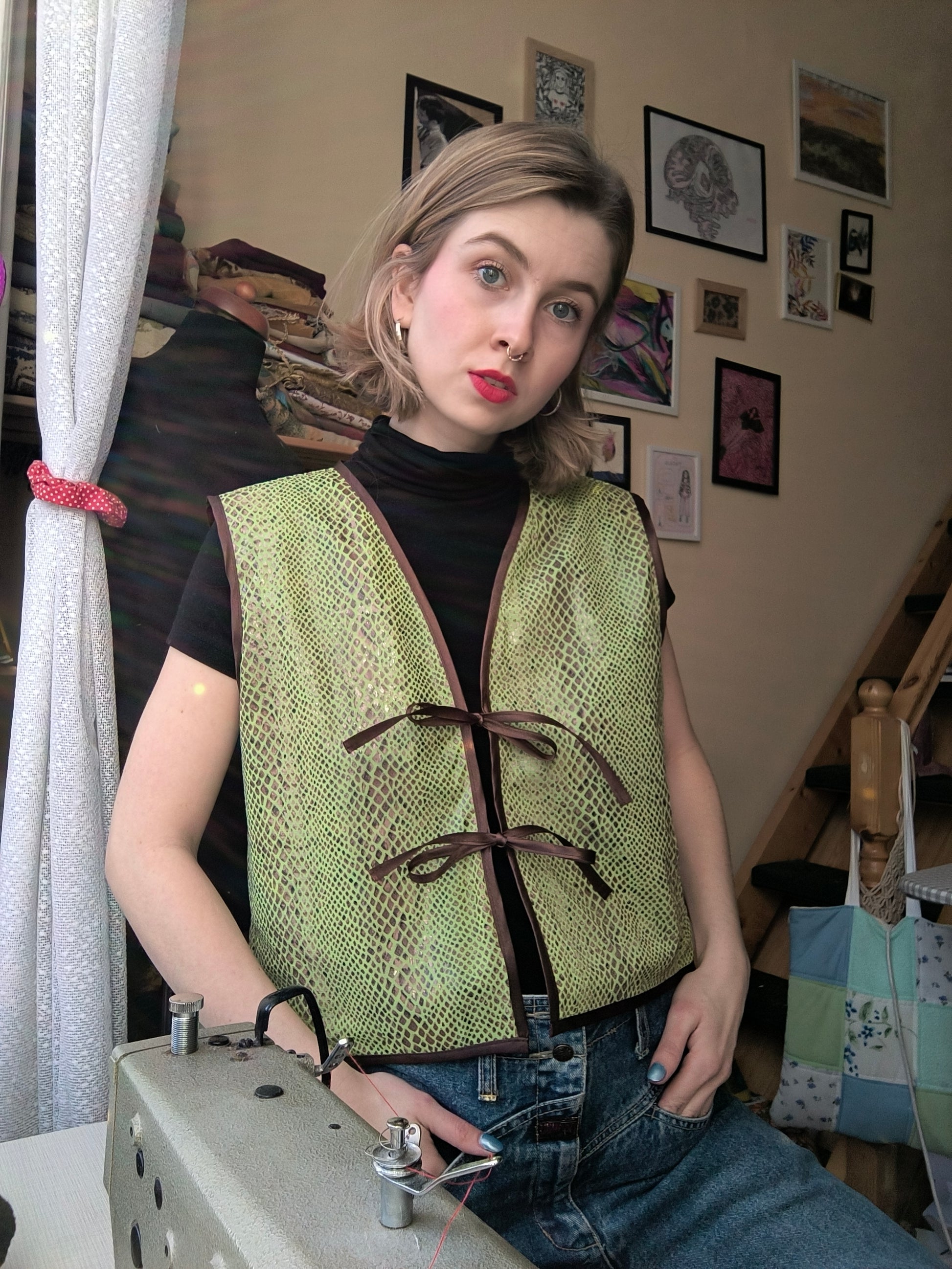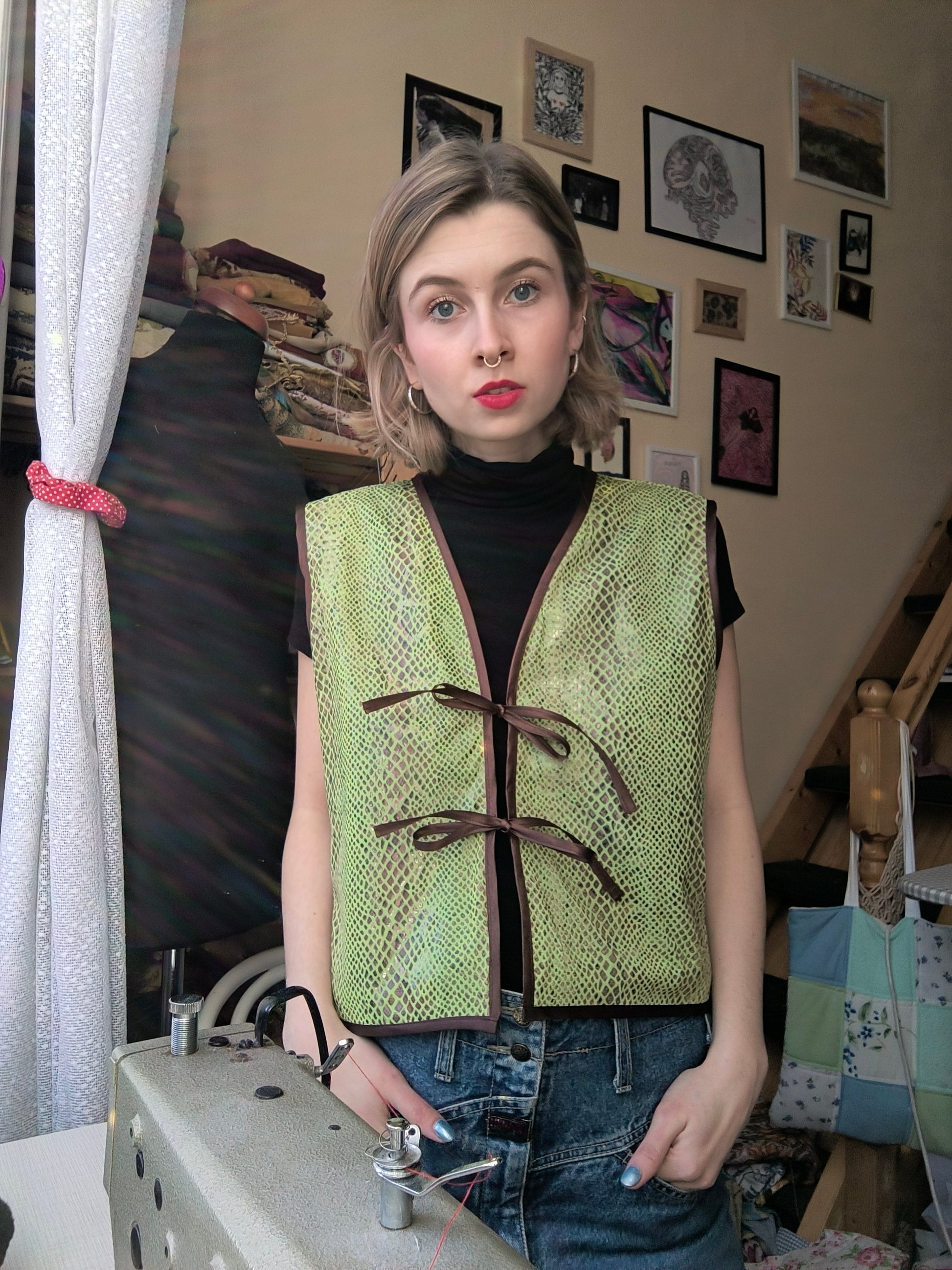 Szabászati maradékból készült, ujjatlan, masnis megkötős blúz, amely egyben mellényként is viselhető. Tökéletes választás egy egyszerű szett feldobásához, laza szabásának köszönhetően pedig igazán kényelmes darab.