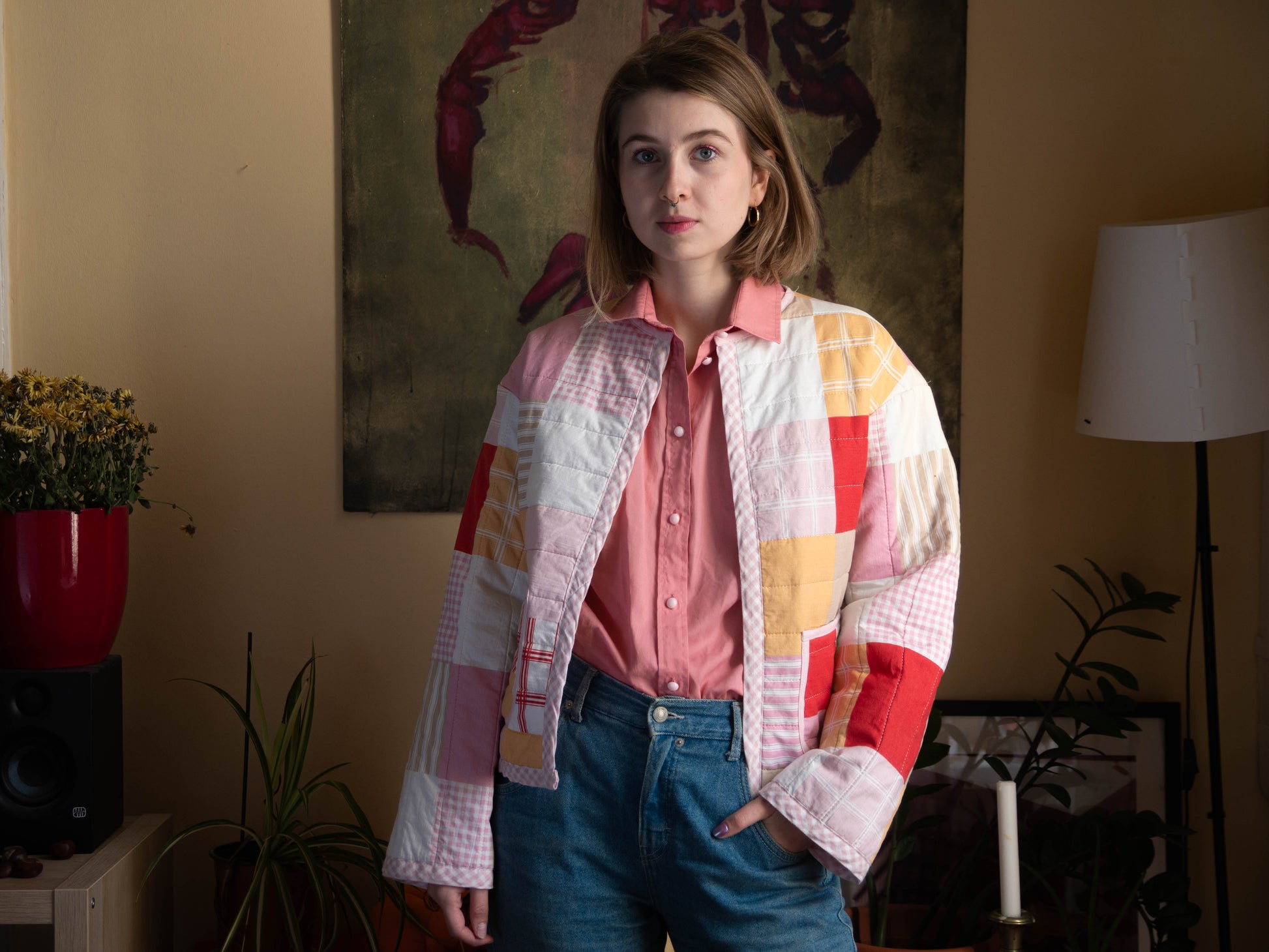 Steppelt ágytakaróból készült egyedi kabát, ami kényelmes, stílusos, meleg és puha is egyben. Ideális lehet egy egyszerű szett feldobásához, de extrább darabokkal is kombinálható.