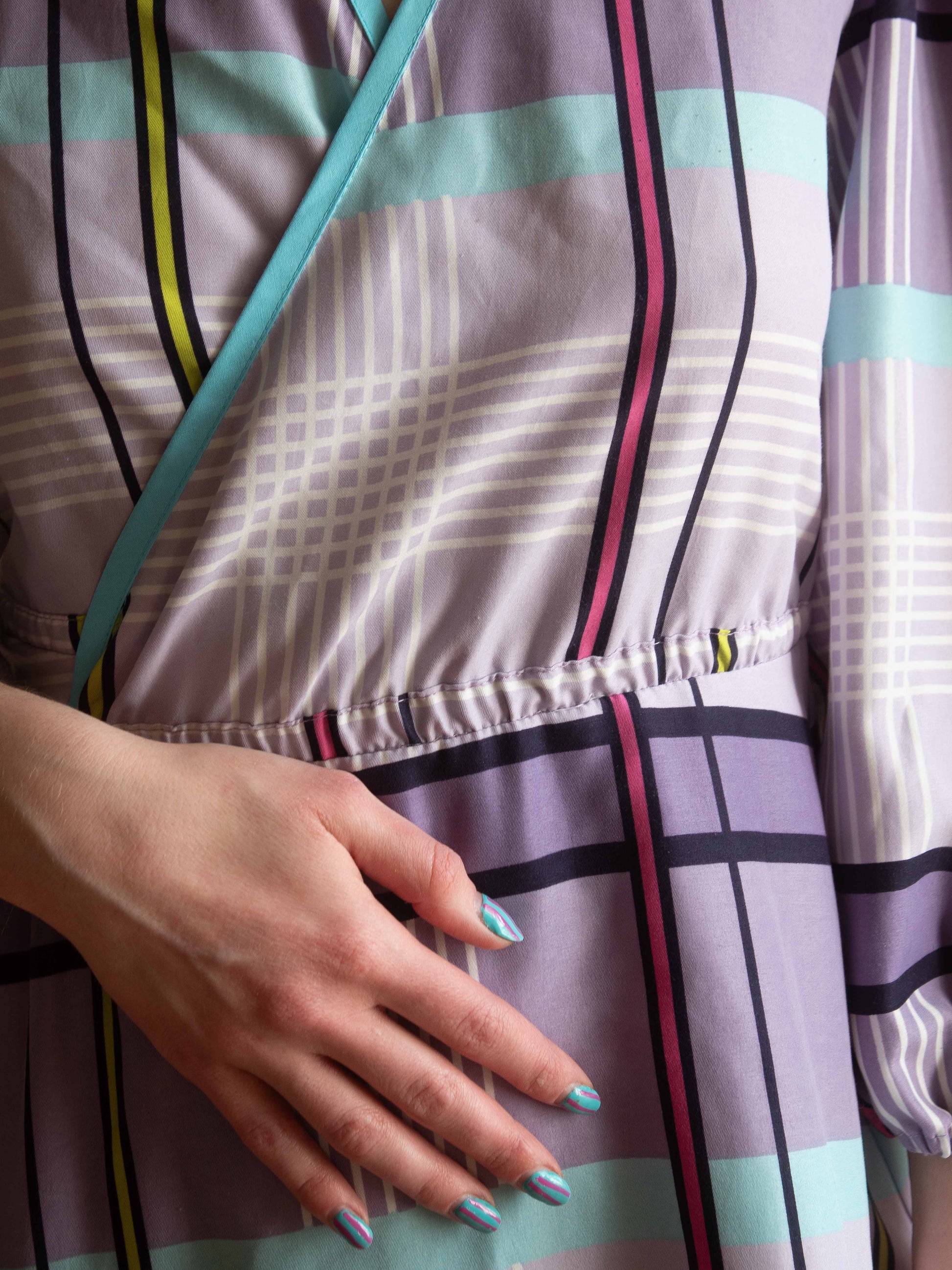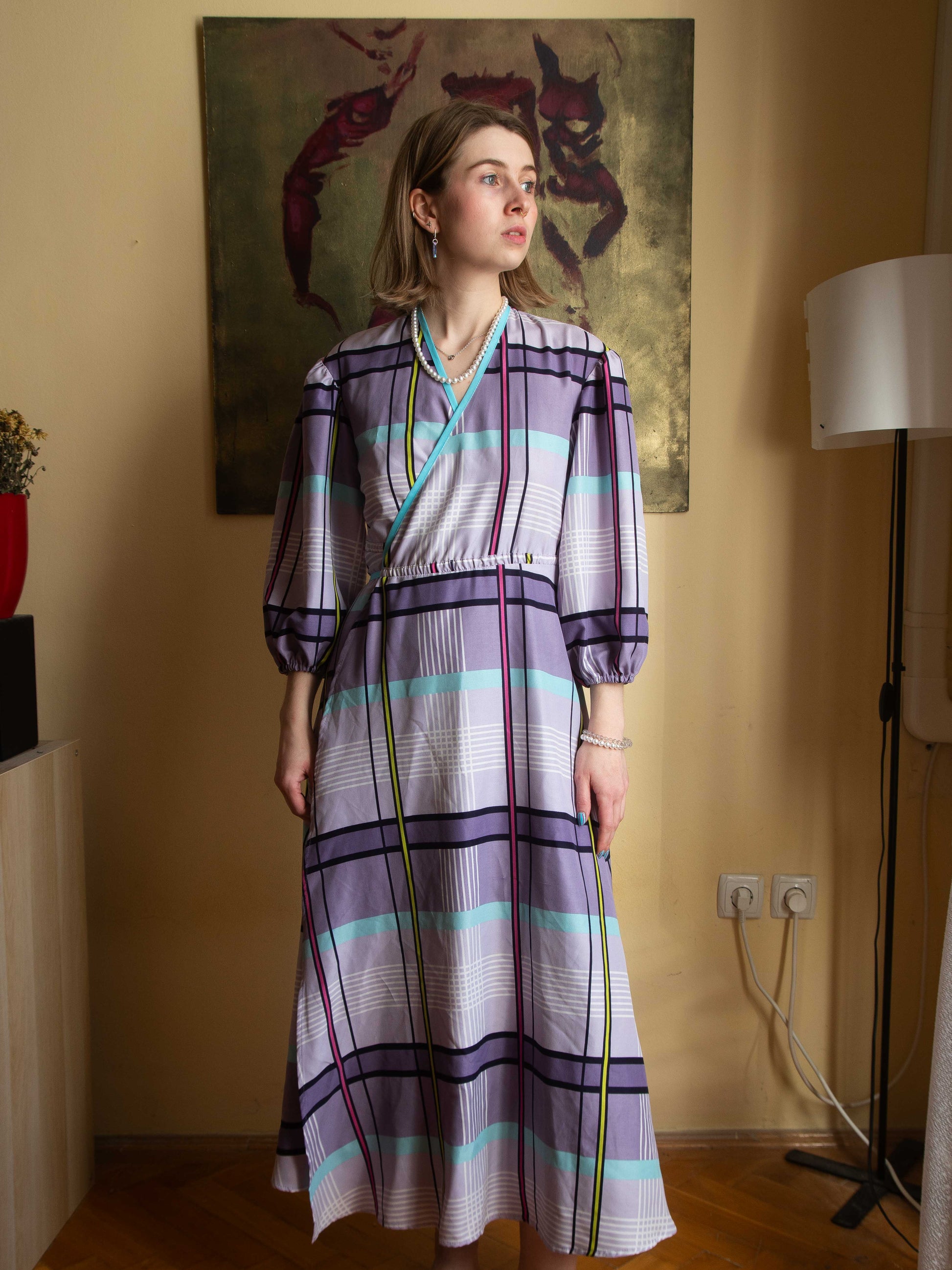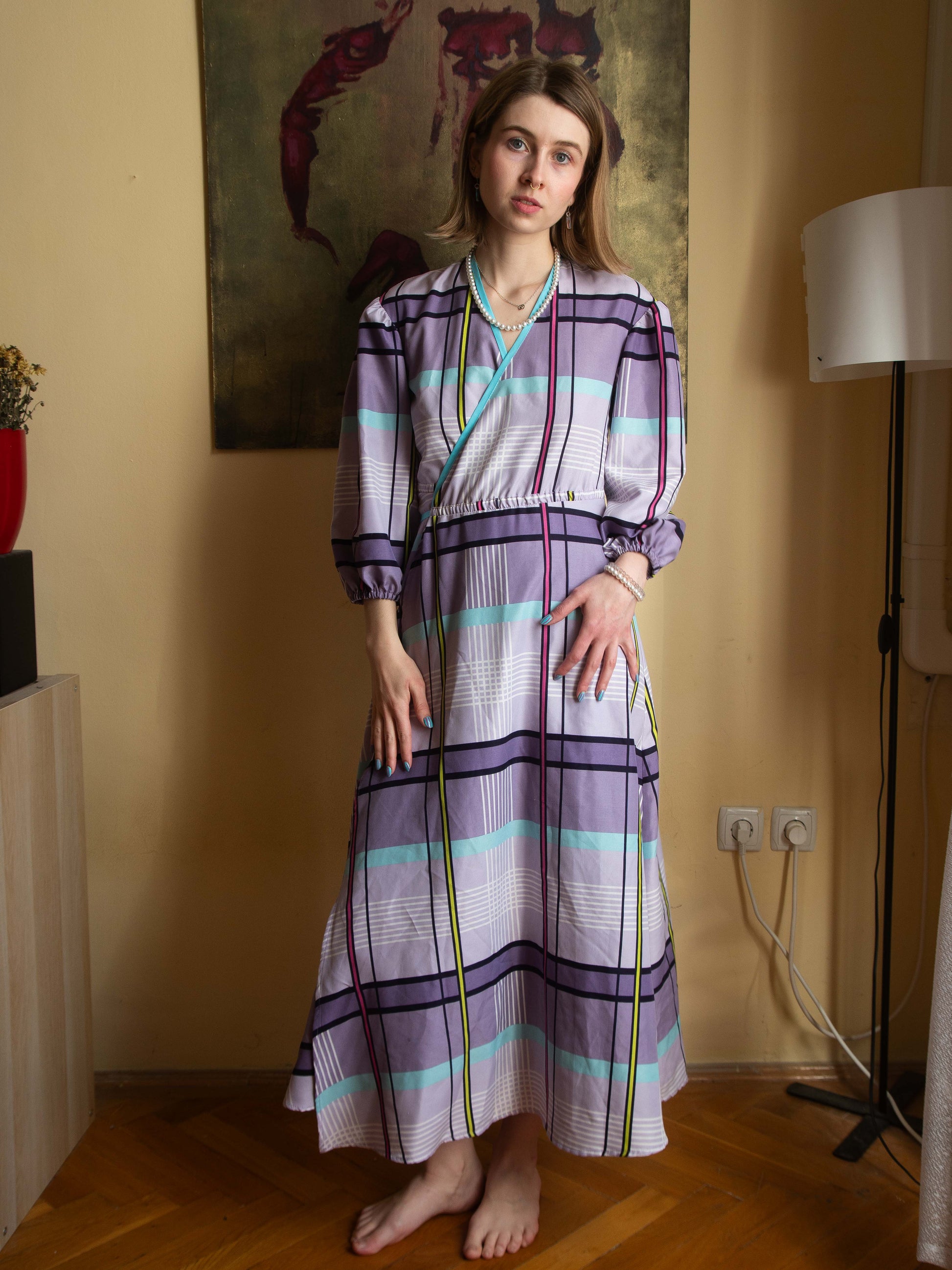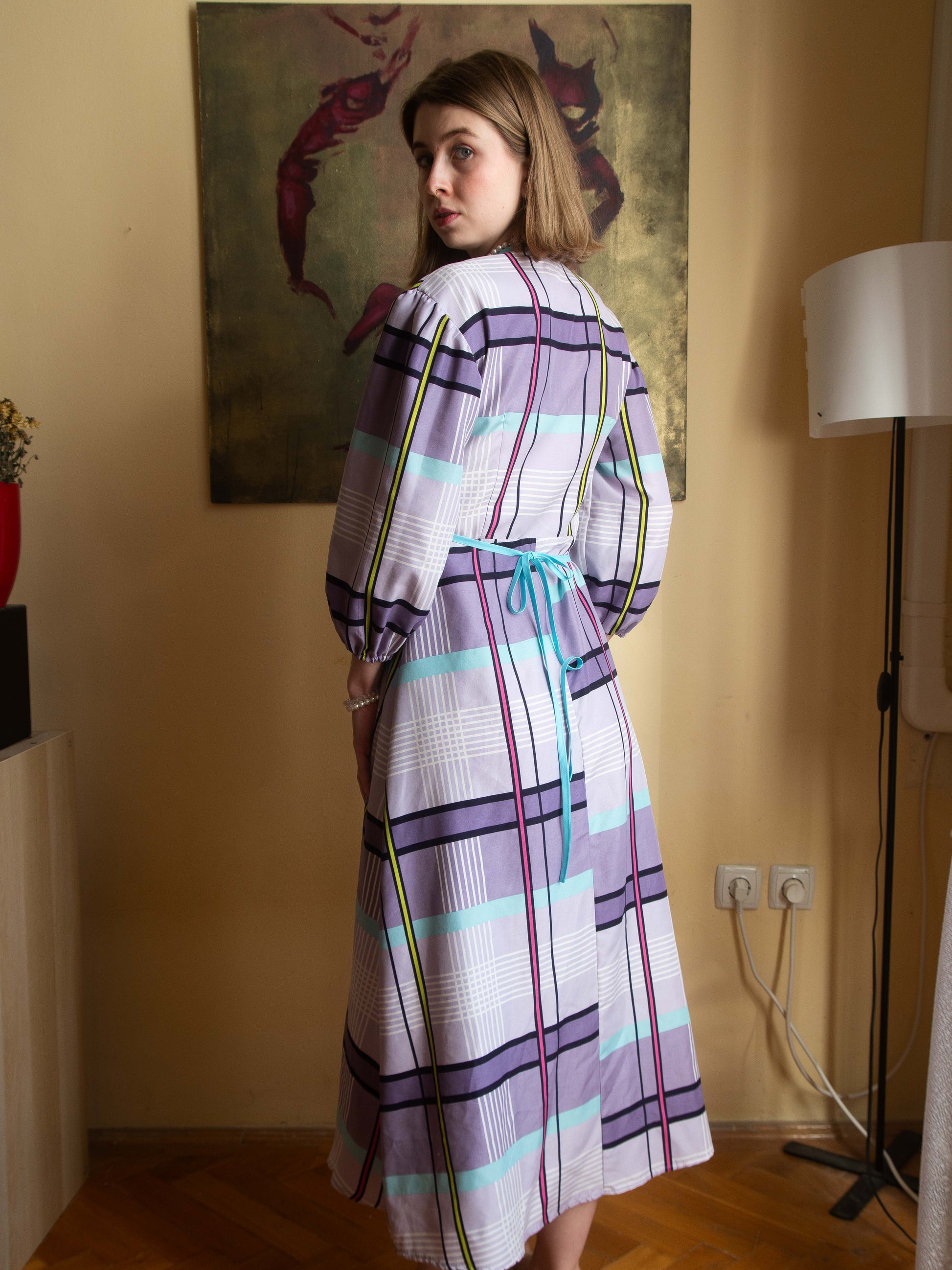 Ágyneműhuzatból készült kockás puffos ujjú átlapolós ruha. A megkötős résznek köszönhetően állítható a mérete.