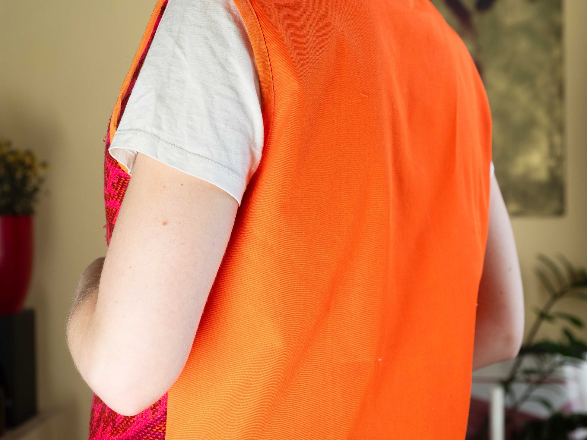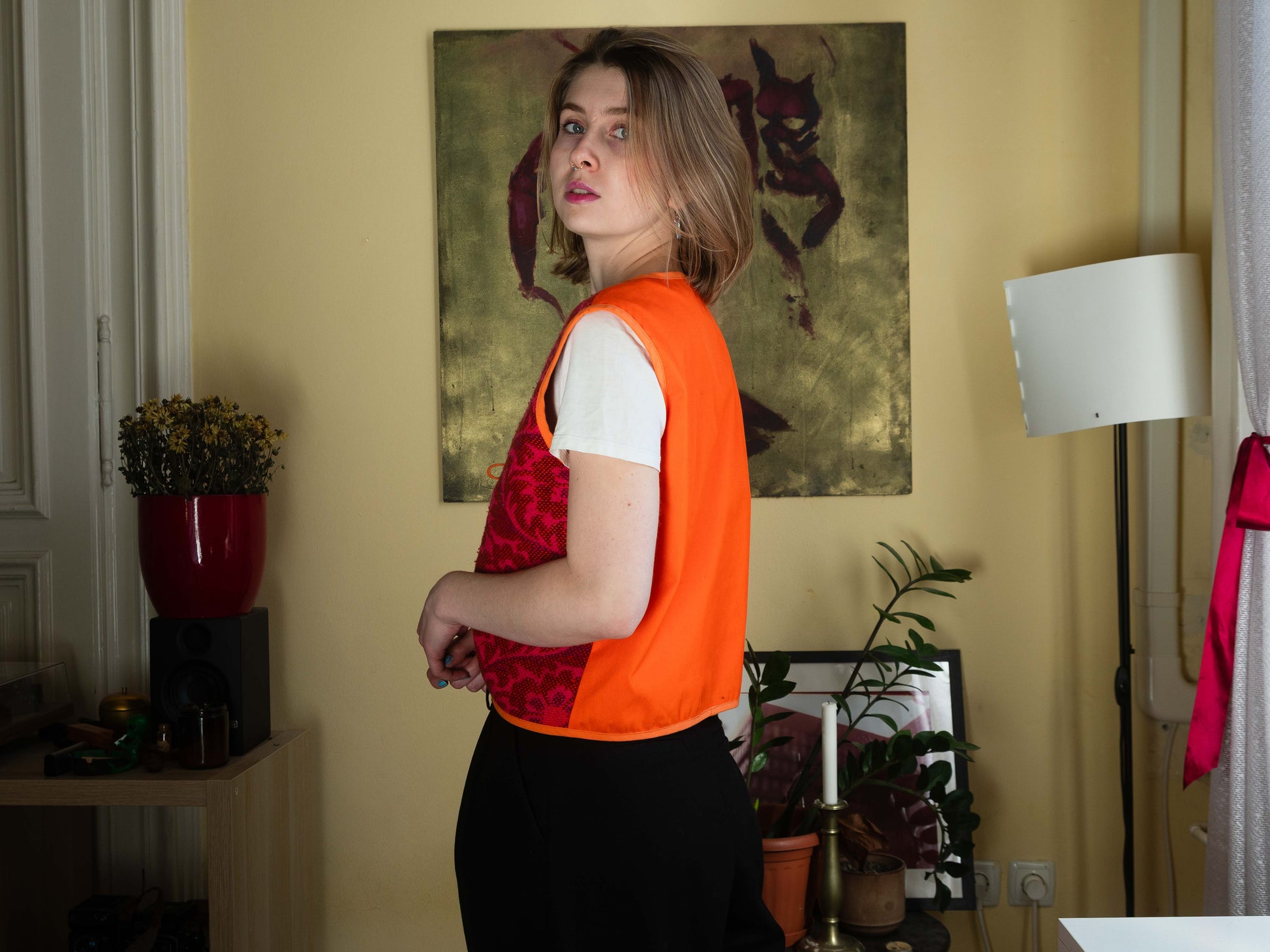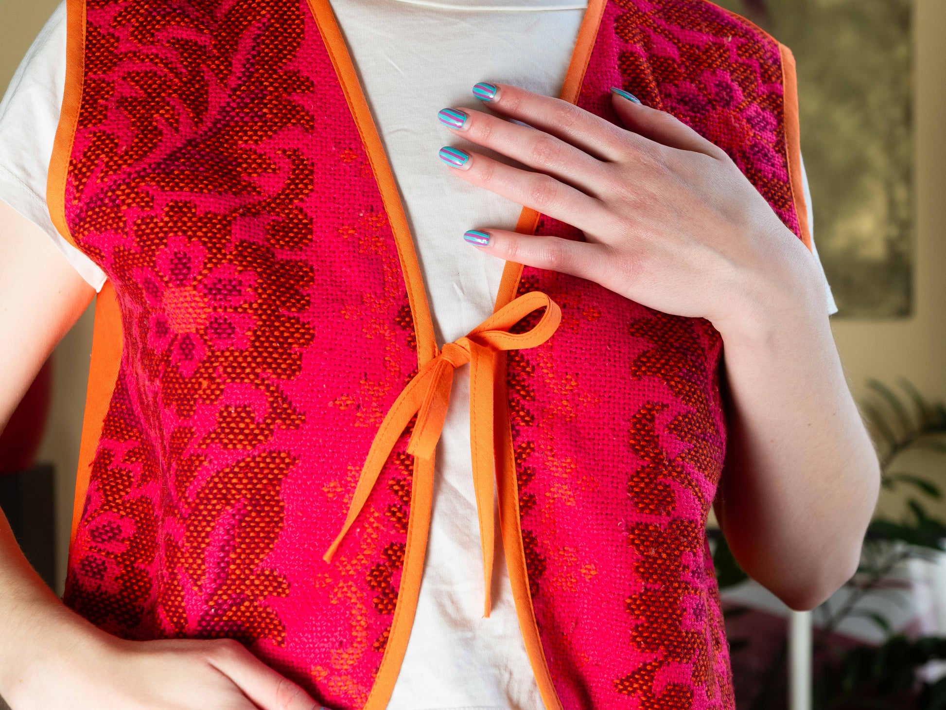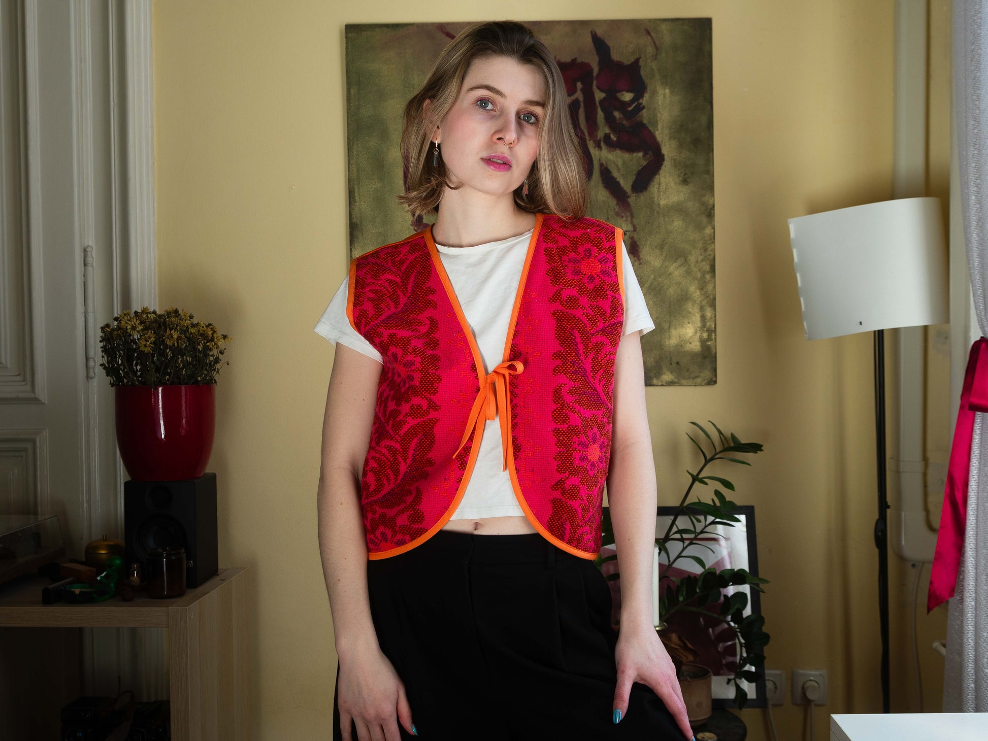 Ágytakaróból és terítőből készült egyedi mellény, ami kényelmes, sítusos, és puha is egyben. Ideális lehet egy egyszerű szett feldobásához, de extrább darabakakol is kombinálható.