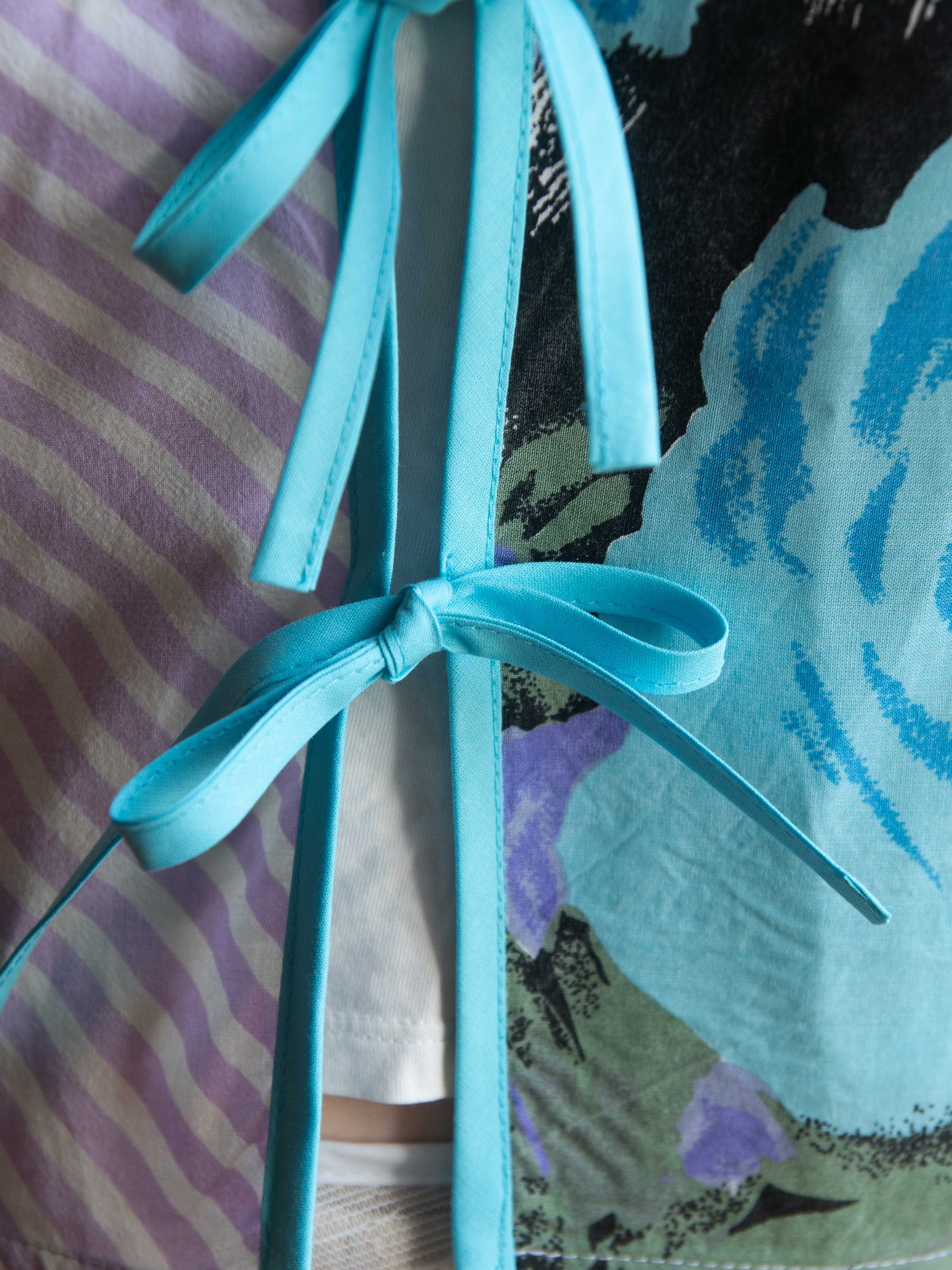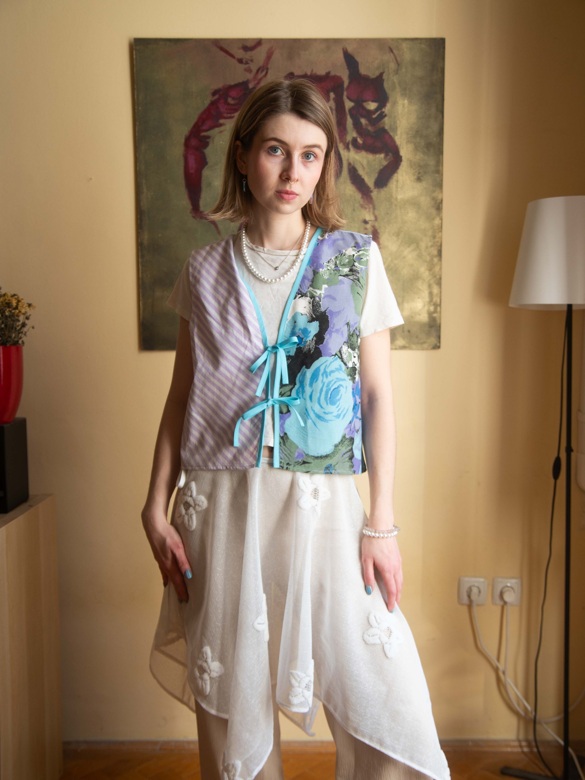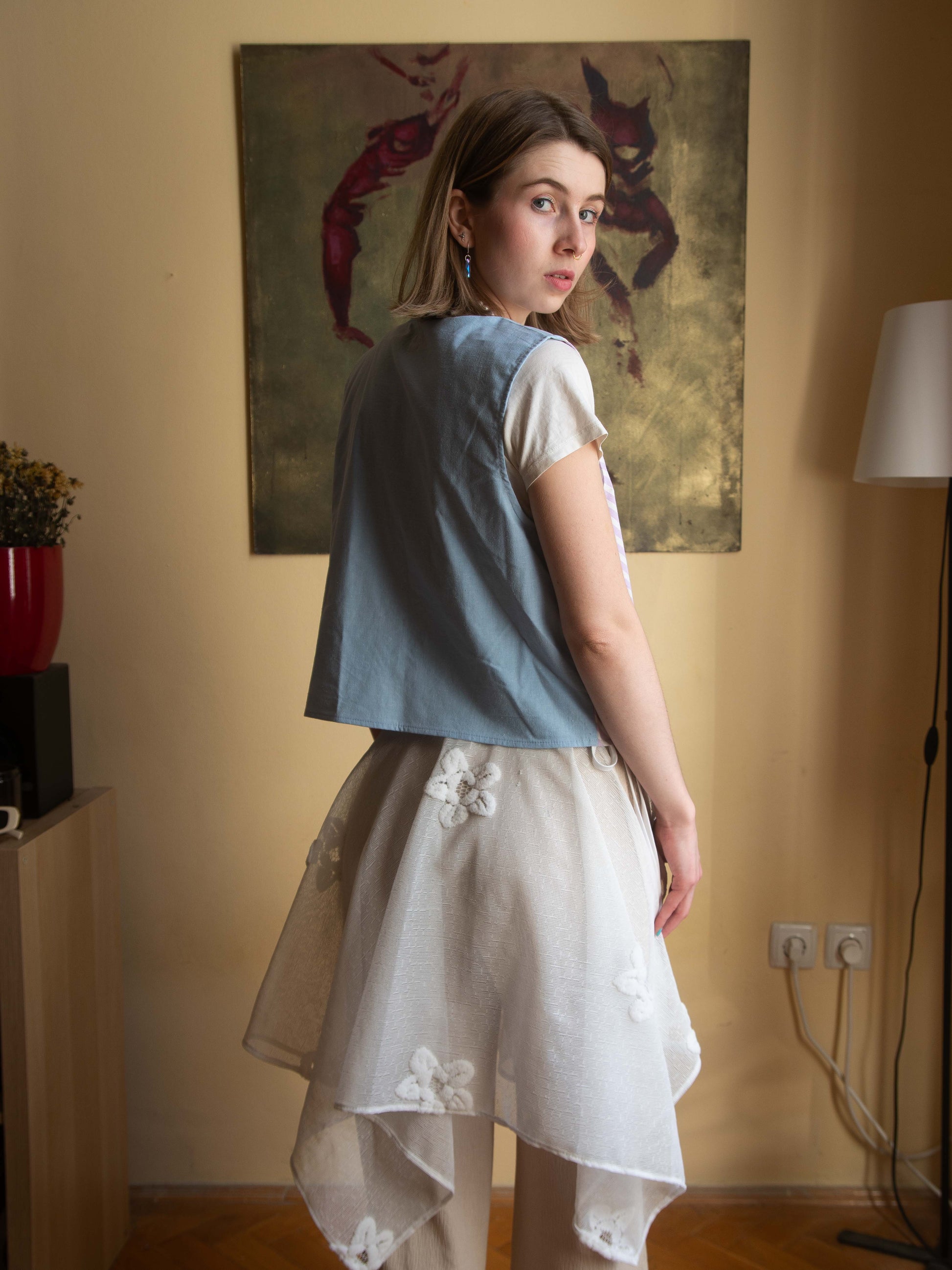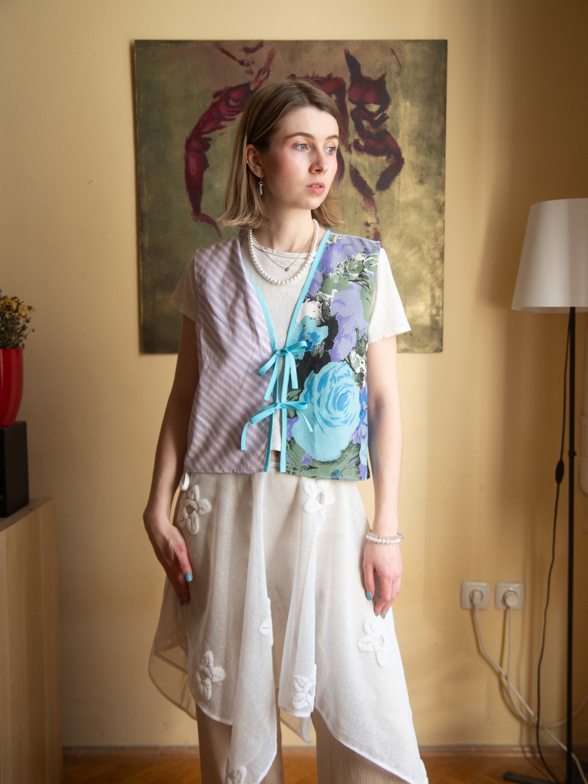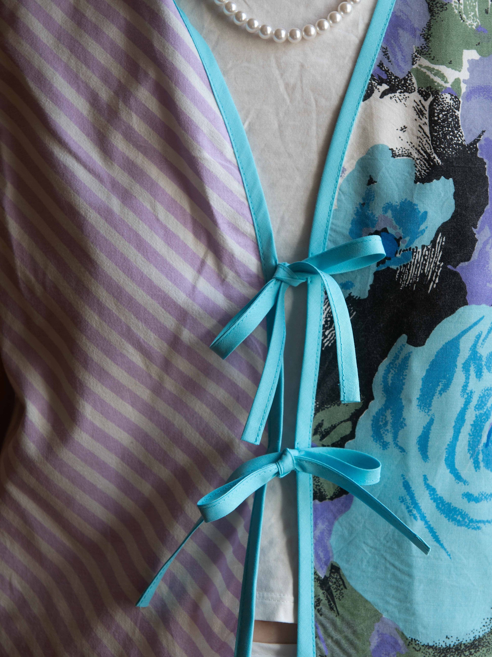 Pamut ágyneműhuzatból készült, ujjatlan, masnis megkötős blúz, amely egyben mellényként is viselhető. Tökéletes választás egy egyszerű szett feldobásához, laza szabásának köszönhetően pedig igazán kényelmes darab.