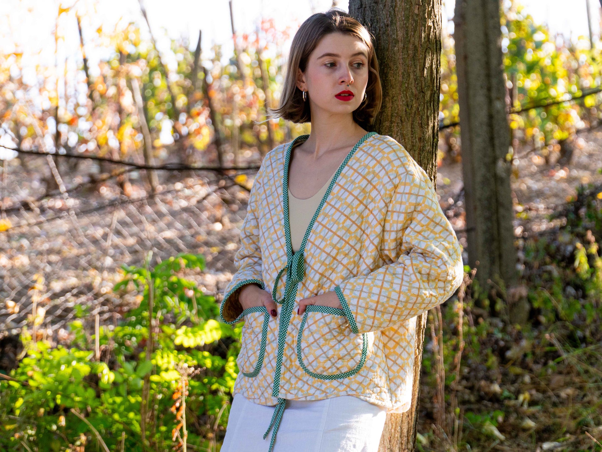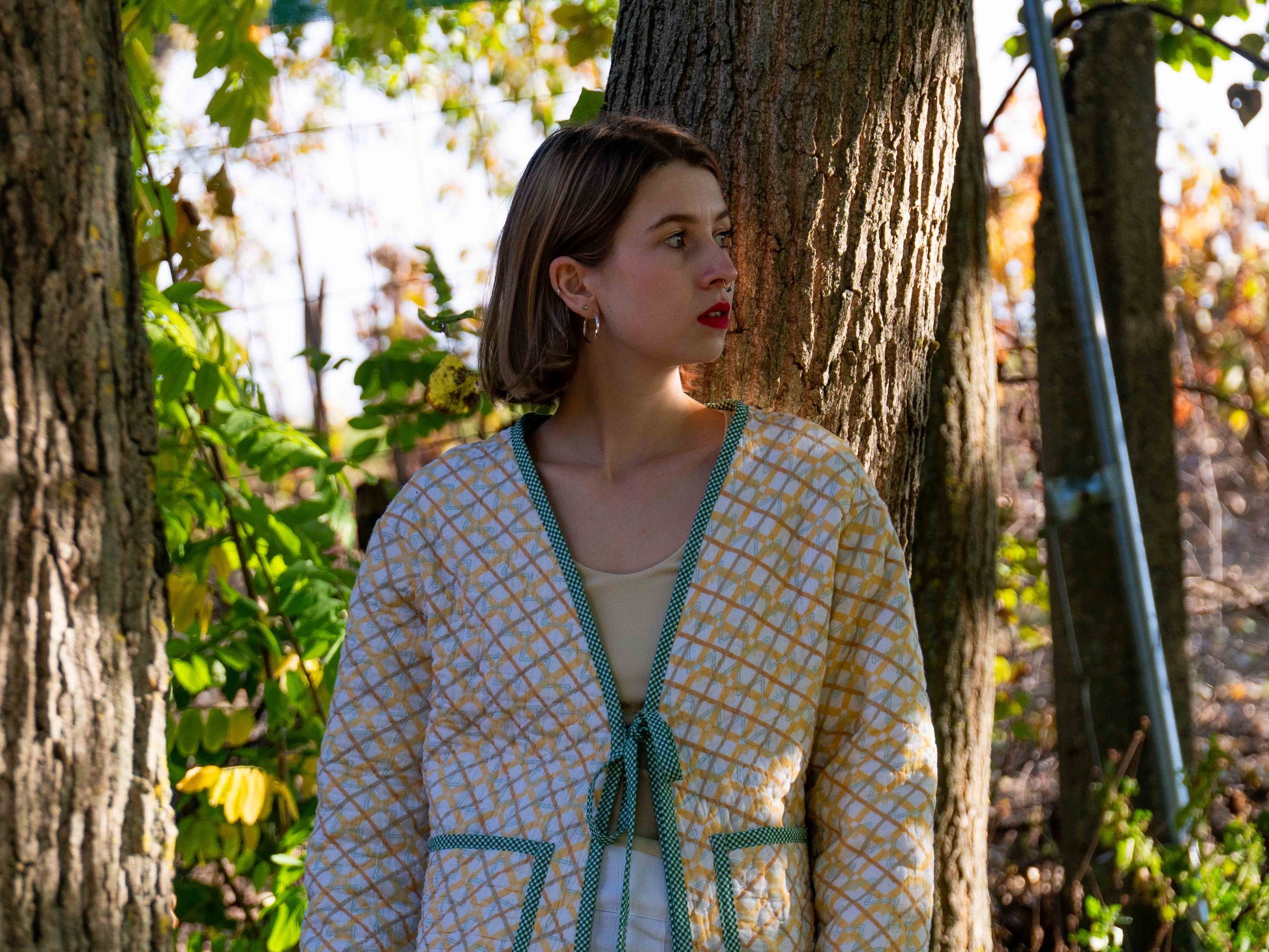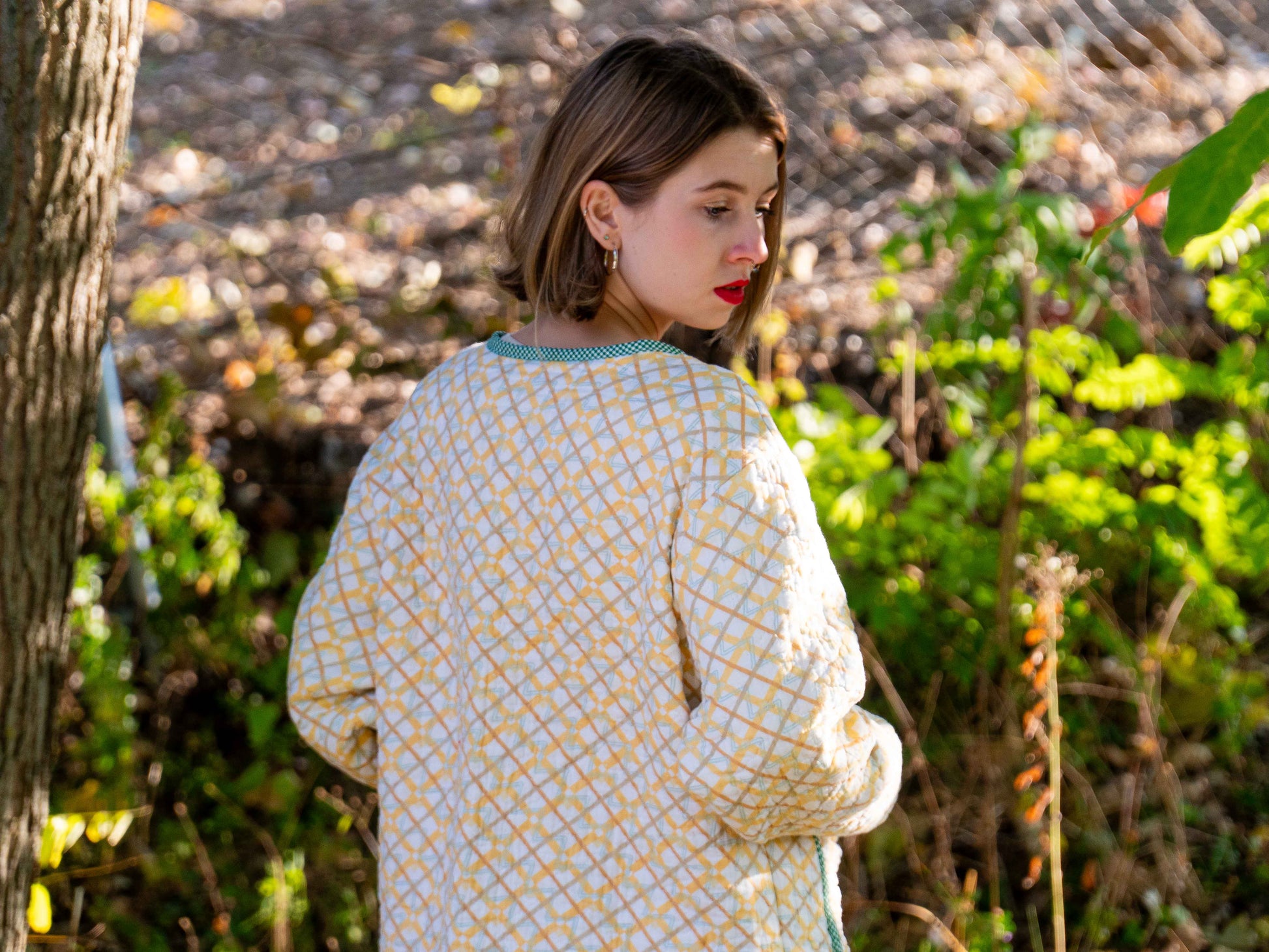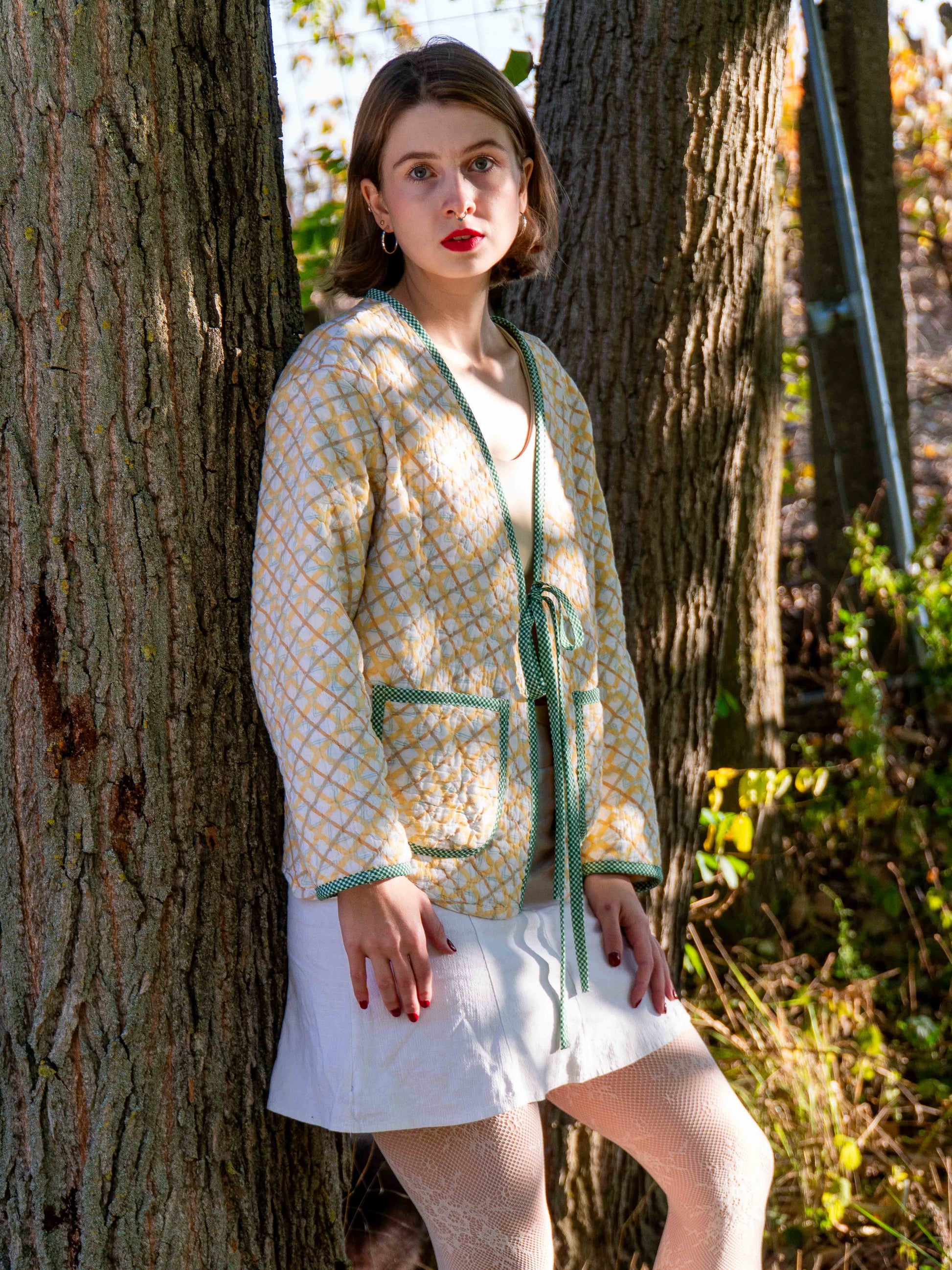 Steppelt ágytakaróból készült egyedi kabát, ami kényelmes, stílusos, meleg és puha is egyben. Ideális lehet egy egyszerű szett feldobásához, de extrább darabokkal is kombinálható.