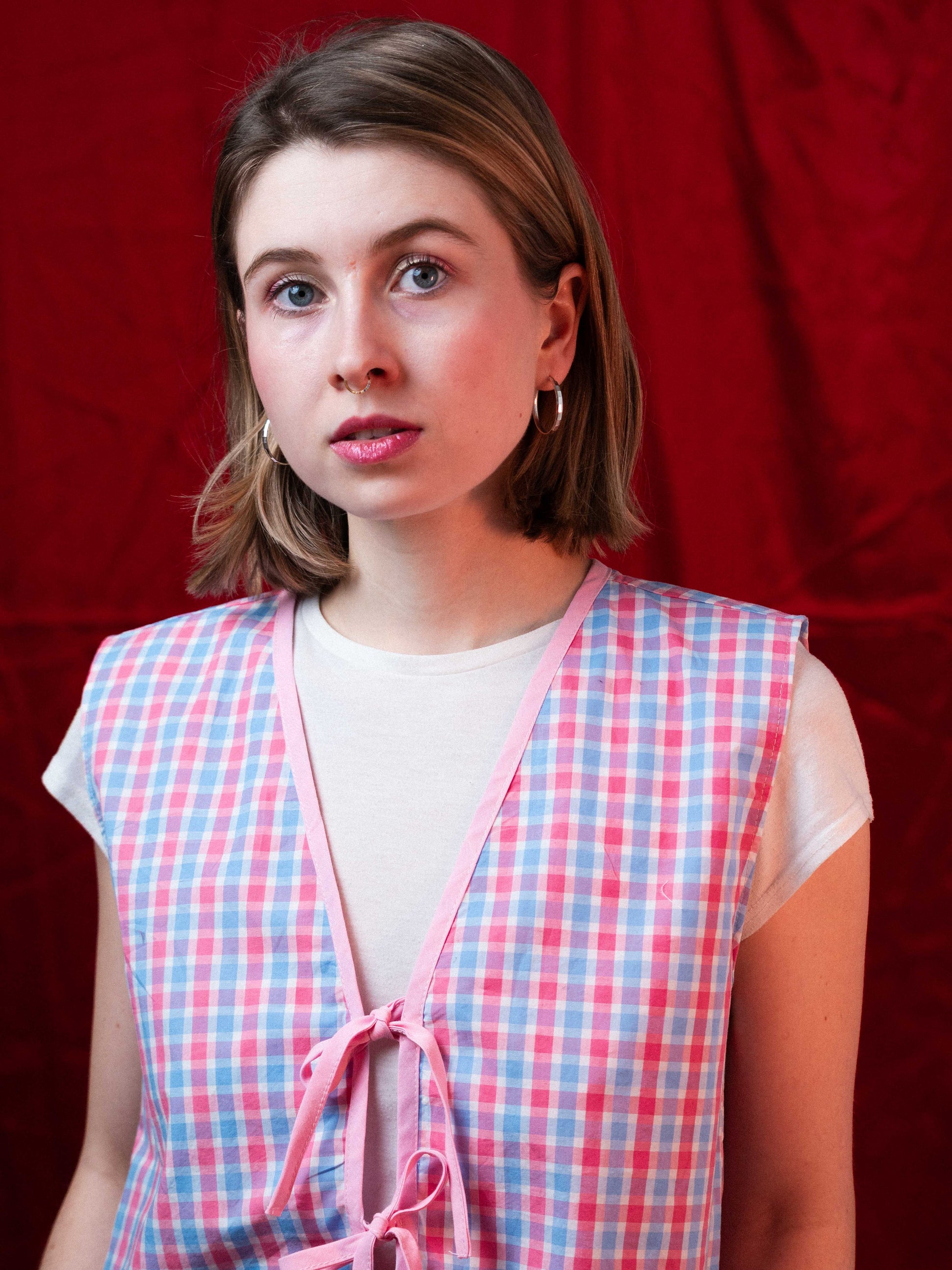 Pamut ingből készült, ujjatlan, masnis megkötős blúz. Laza szabásának köszönhetően könnyed és jól szellőzik, akár mellényként is hordható.