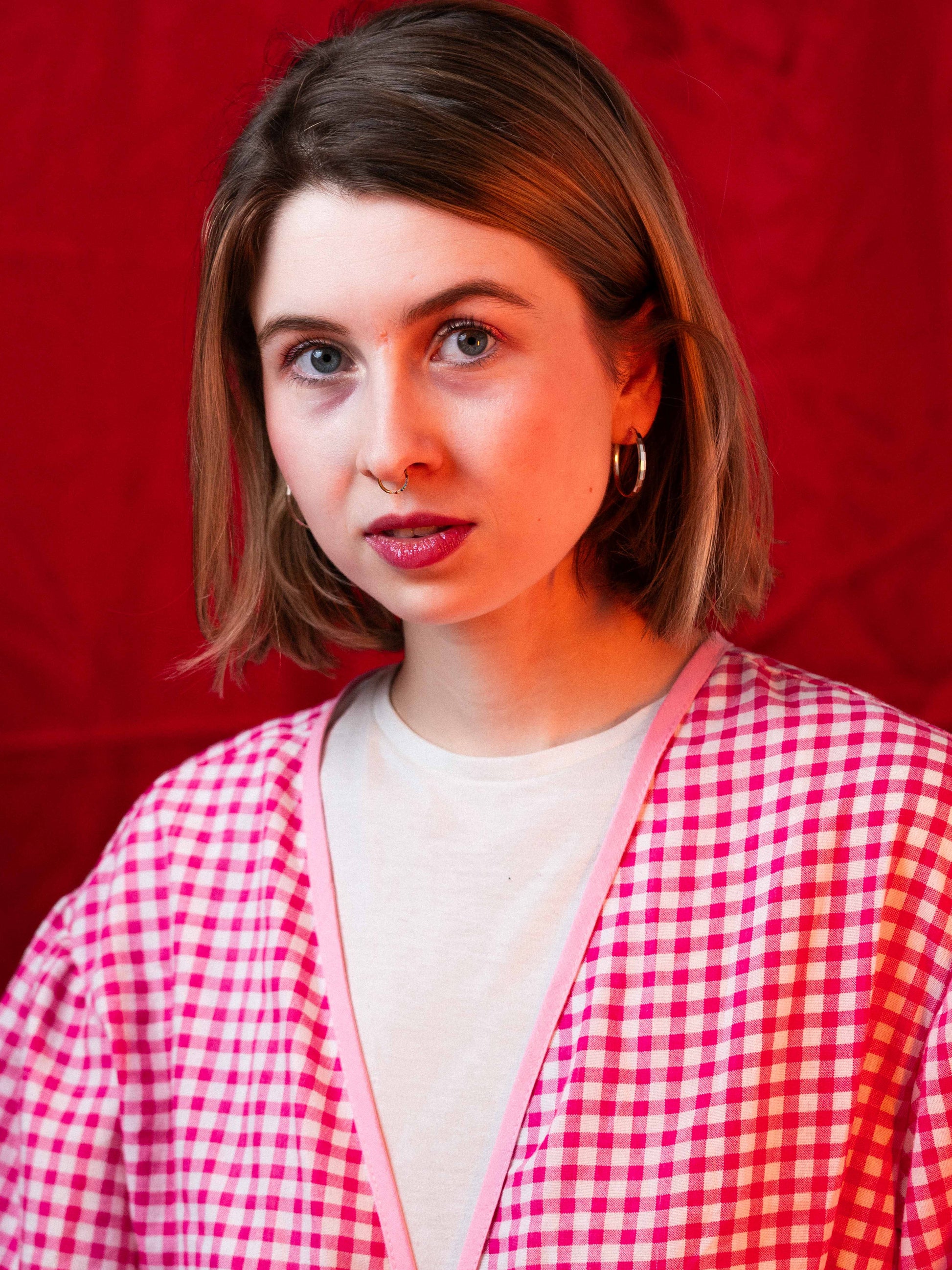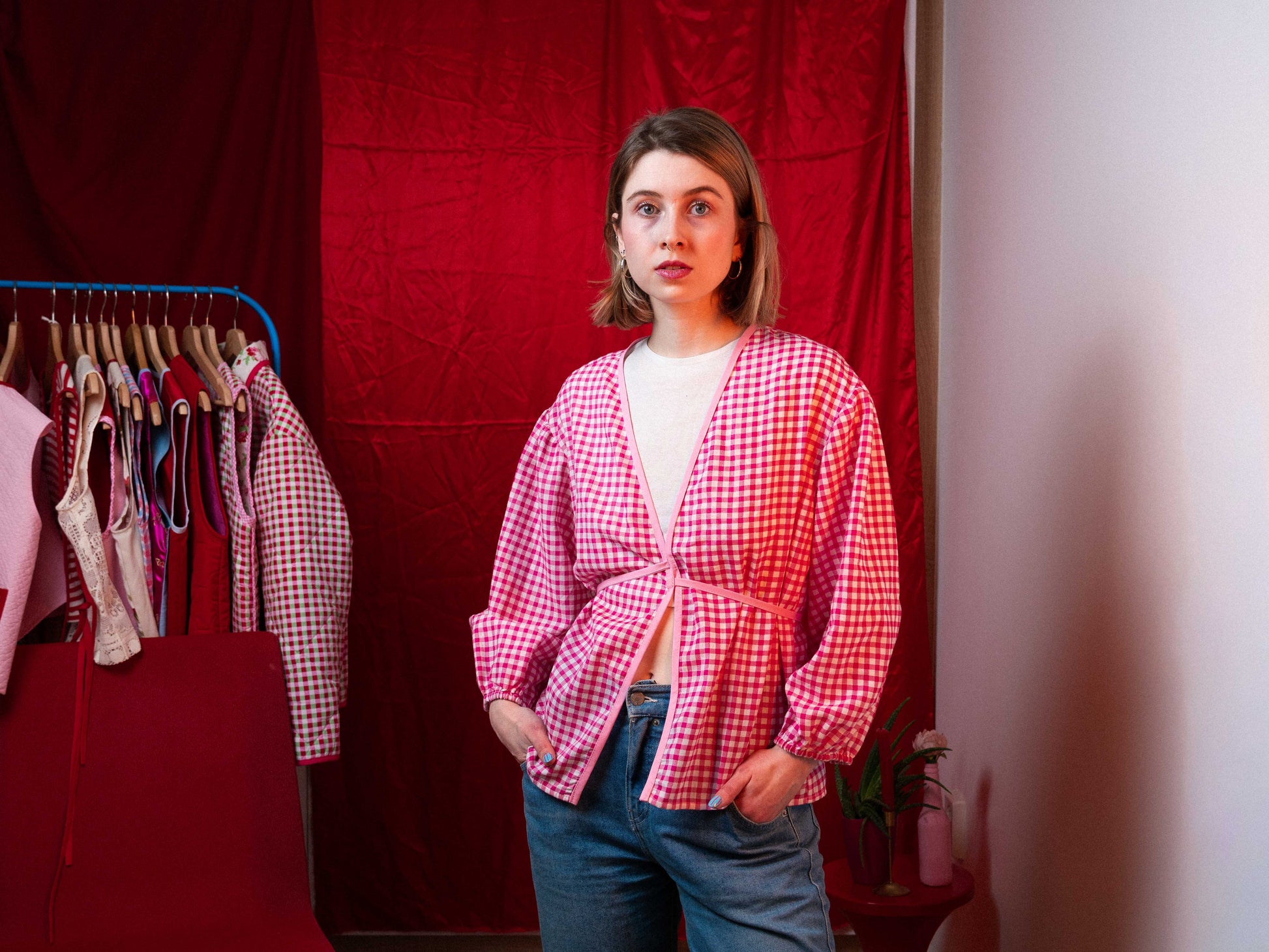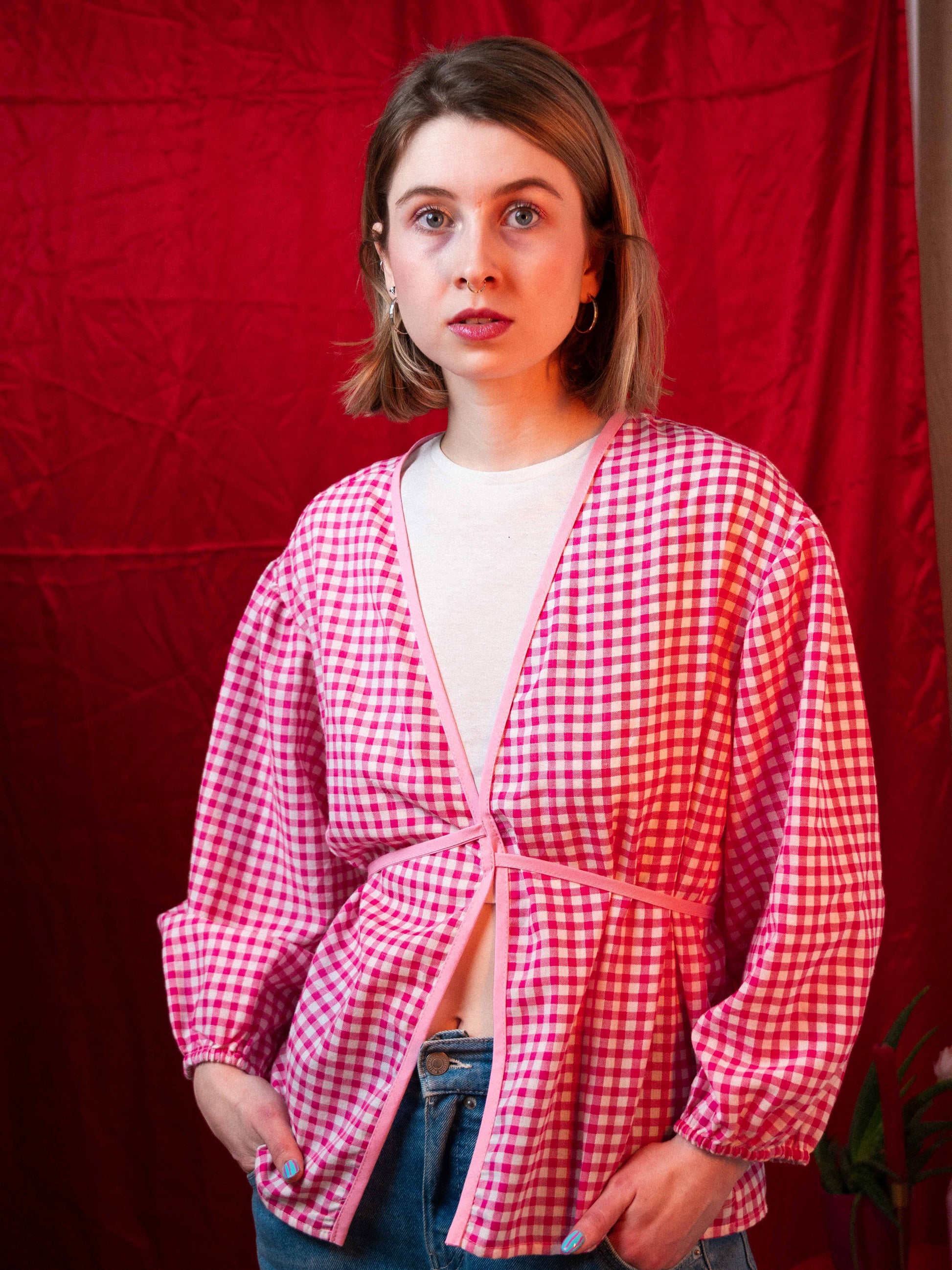 Ágyneműhuzatból készült egyedi rózsaszín kockás puffos felső, ami kényelmes, stílusos is egyben. Ideális lehet egy egyszerű szett feldobásához, de extrább darabokkal is kombinálható.