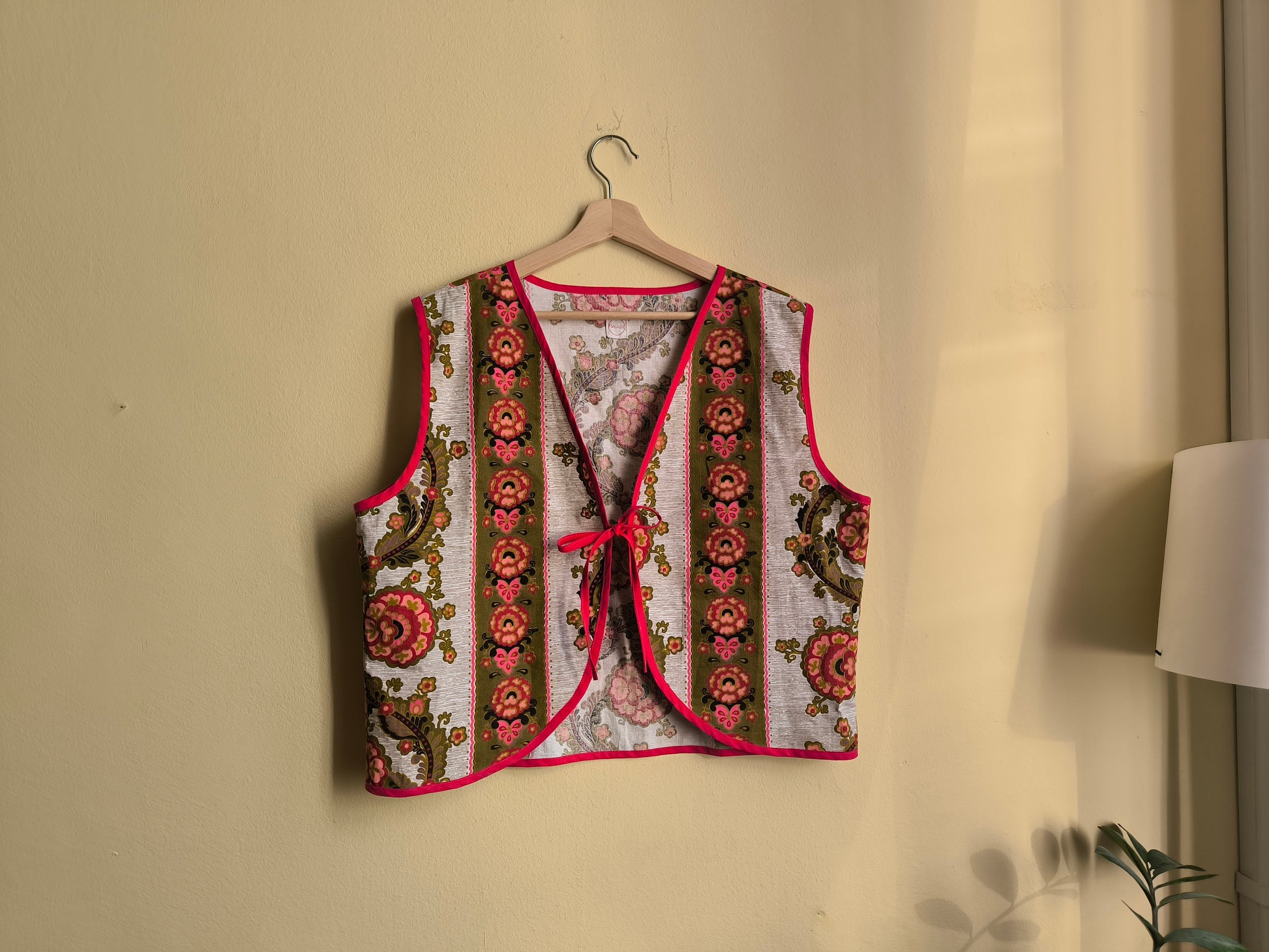 Terítőből készült, ujjatlan, masnis megkötős blúz, amely egyben mellényként is viselhető. Tökéletes választás egy egyszerű szett feldobásához, laza szabásának köszönhetően pedig igazán kényelmes darab.