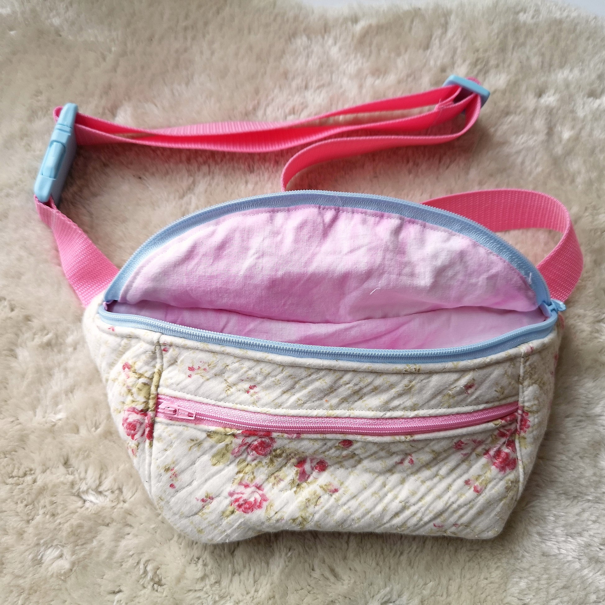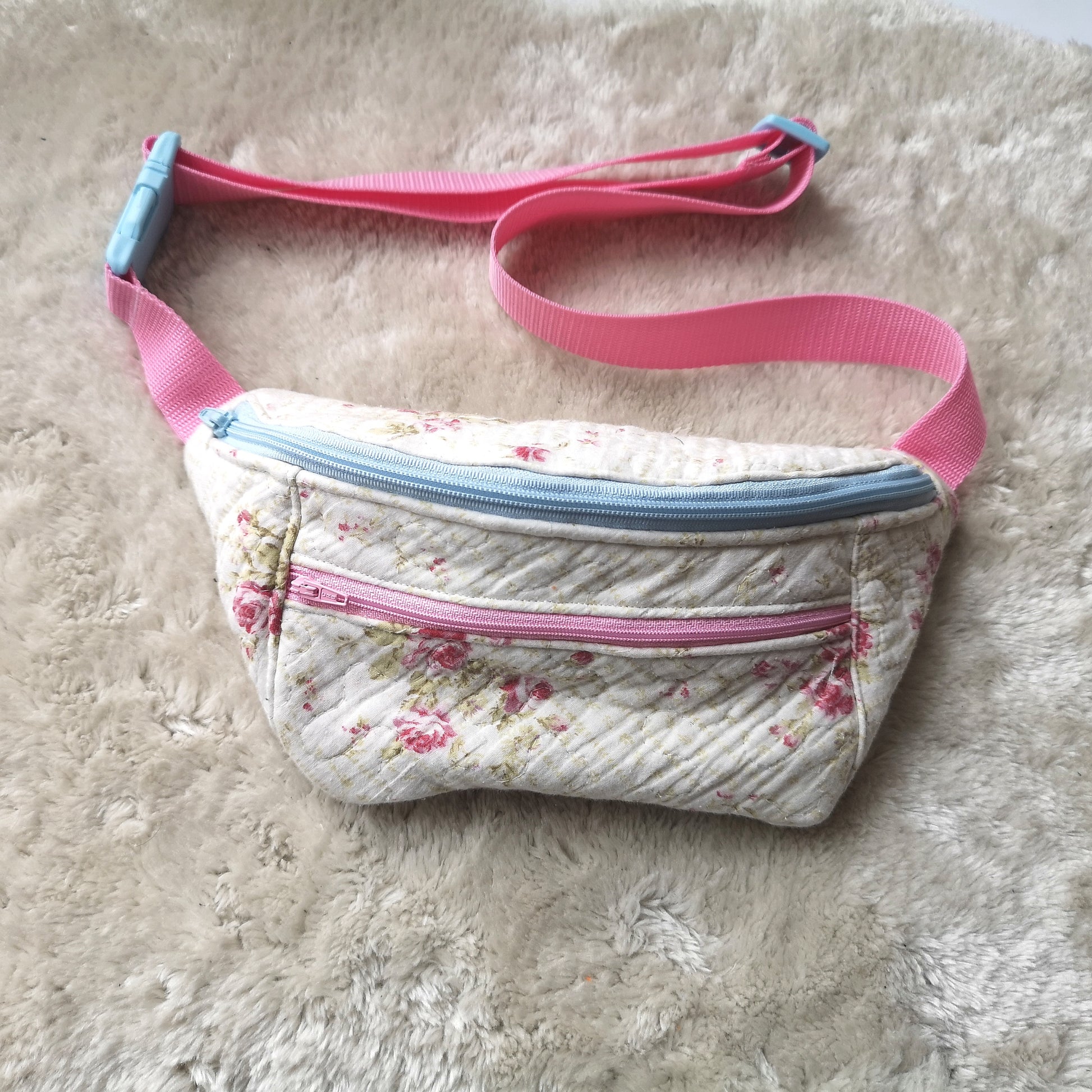 Anyagmaradékokból készült rózsaszín virágos övtáska.