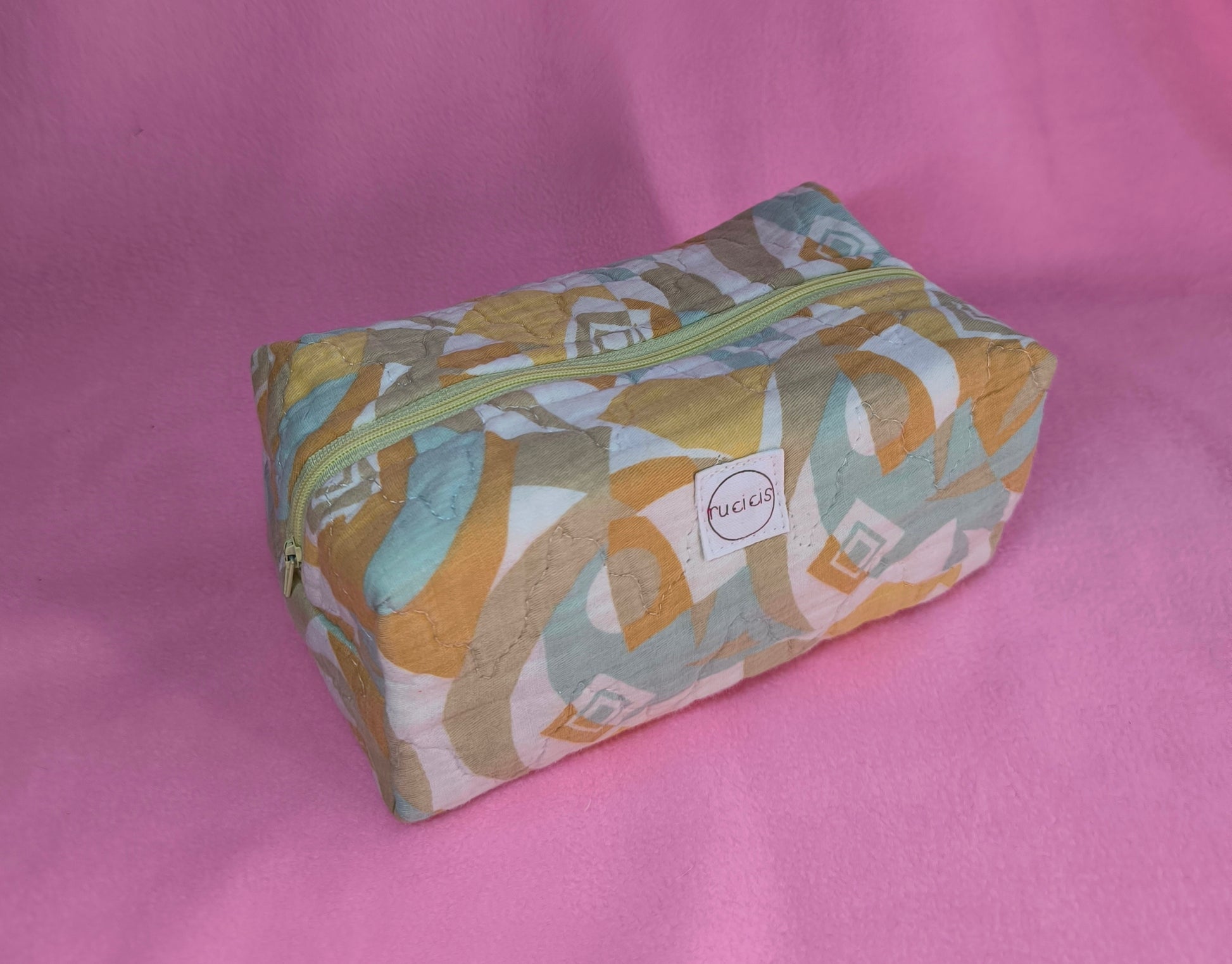 Ez a neszeszer steppelt ágytakaróból készült, pamut vászon béléssel és vidám, színes cipzárral. Praktikus társ a mindennapokban: elfér benne smink, apró kozmetikumok, vagy éppen azok a kis dolgok, amik mindig elkeverednek a táskában.