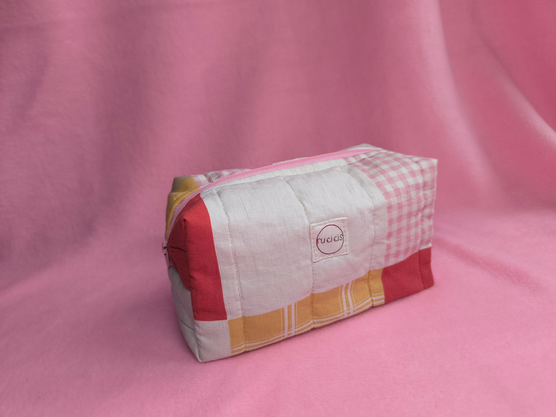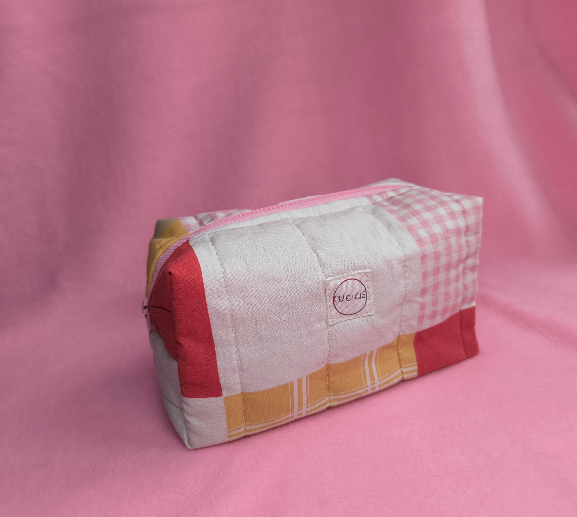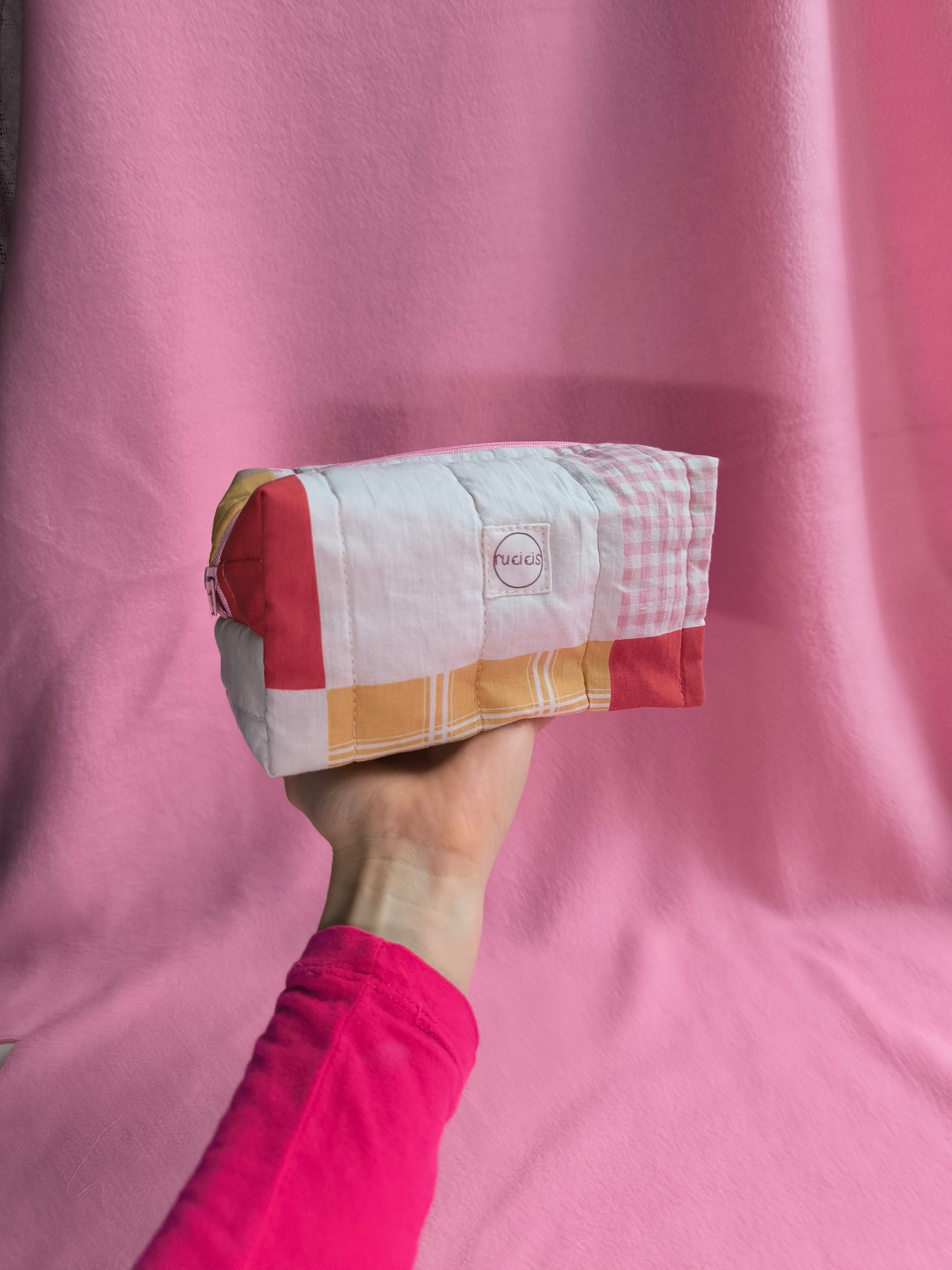 Ez a neszeszer steppelt ágytakaróból készült, pamut vászon béléssel és vidám, színes cipzárral. Praktikus társ a mindennapokban: elfér benne smink, apró kozmetikumok, vagy éppen azok a kis dolgok, amik mindig elkeverednek a táskában.