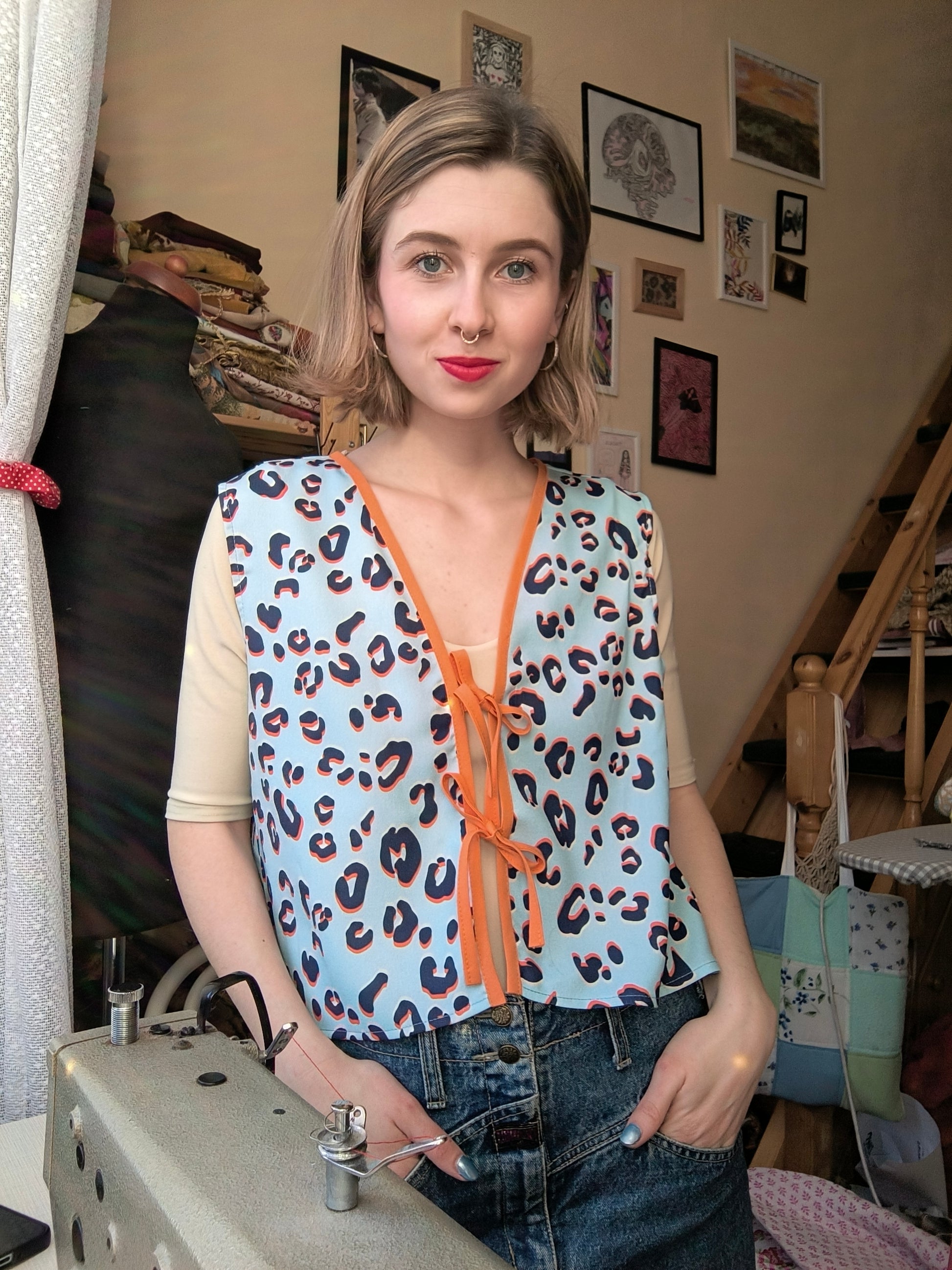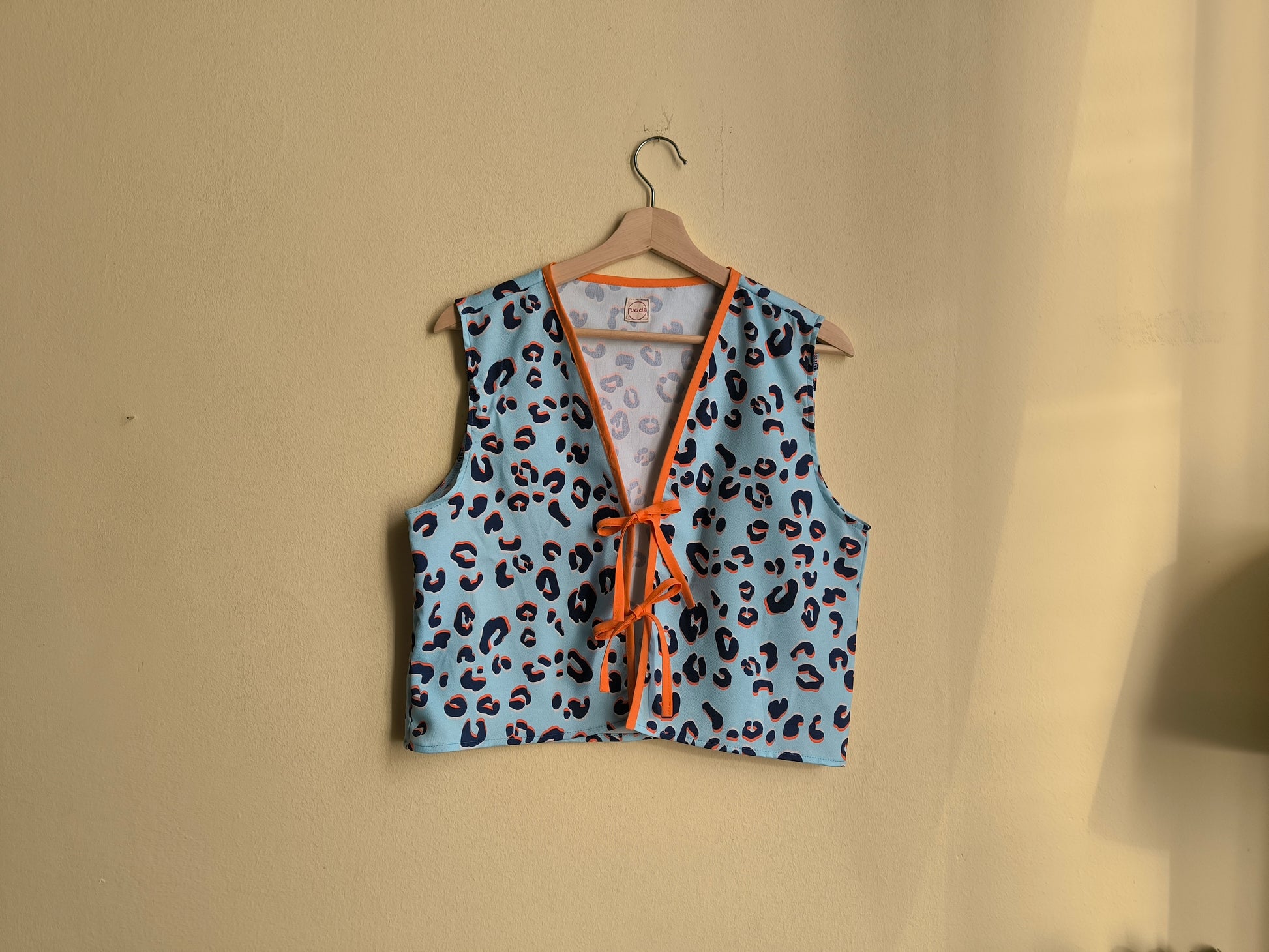 Szabászati maradékból készült, ujjatlan, masnis megkötős blúz, amely egyben mellényként is viselhető. Tökéletes választás egy egyszerű szett feldobásához, laza szabásának köszönhetően pedig igazán kényelmes darab.