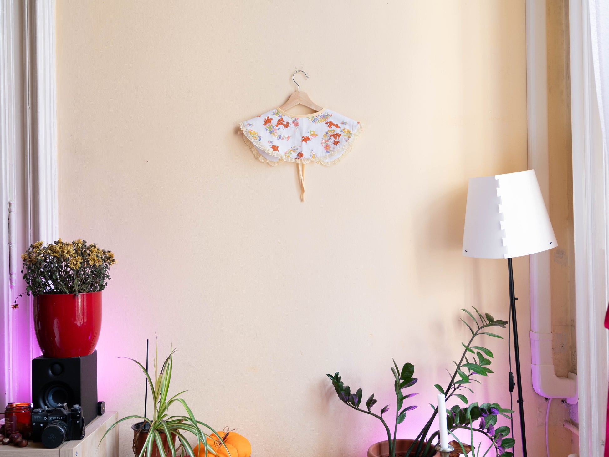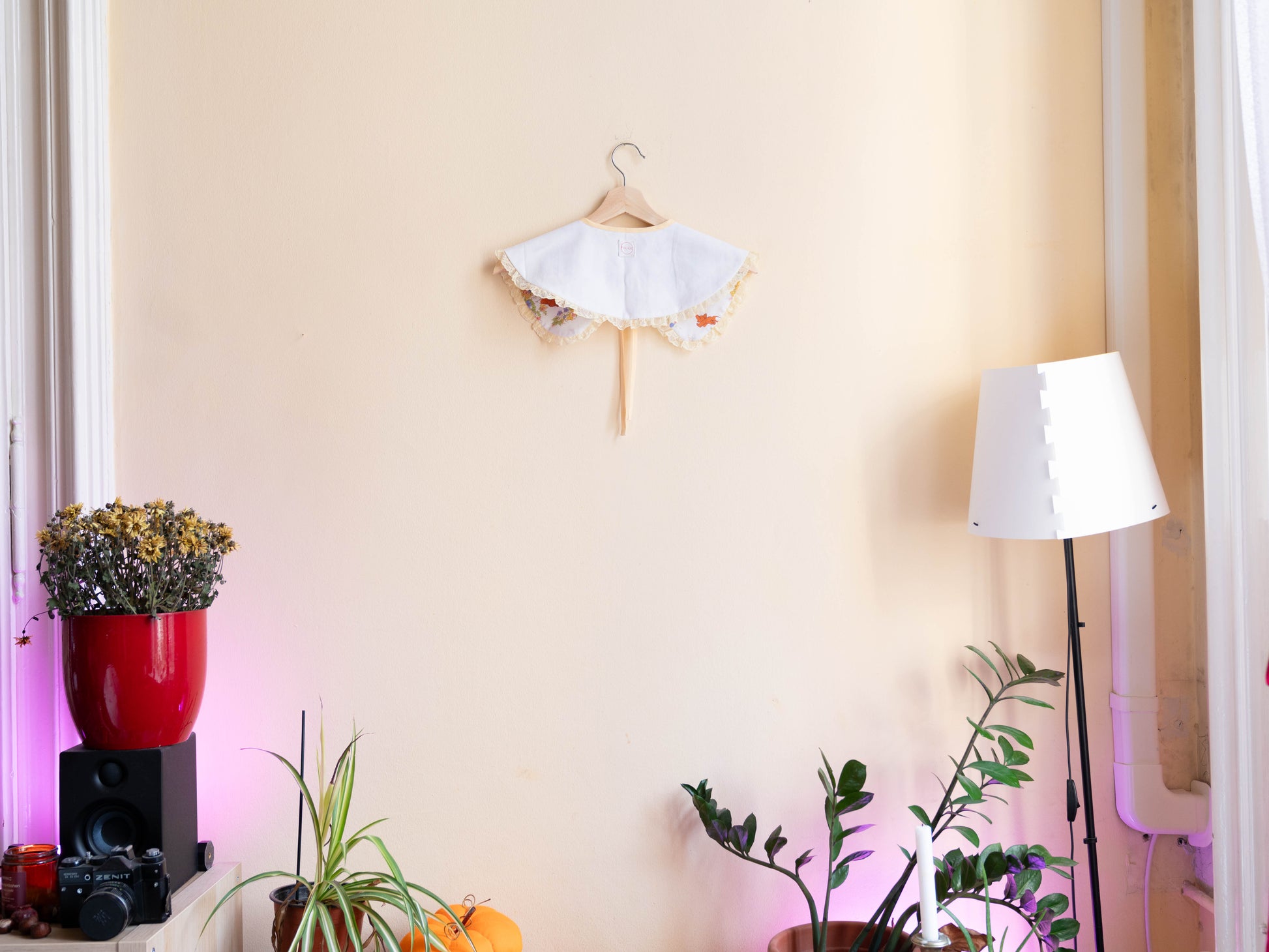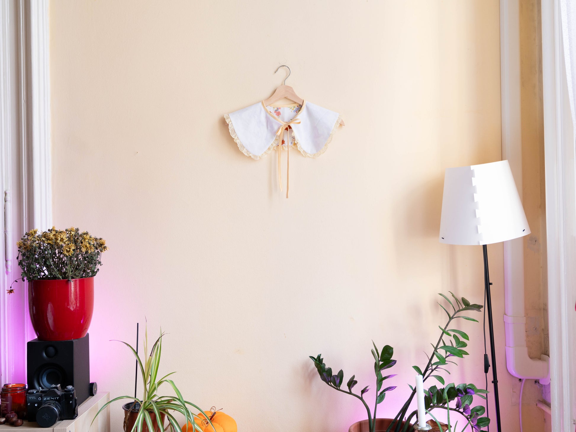Az elöl megkötős megoldásnak köszönhetően a gallér mérete rugalmasan állítható, mégis stabilan tart. Egy egyszerű pólóra vagy ruhára is könnyedén ad hozzá egy játékos, személyes jelleget.