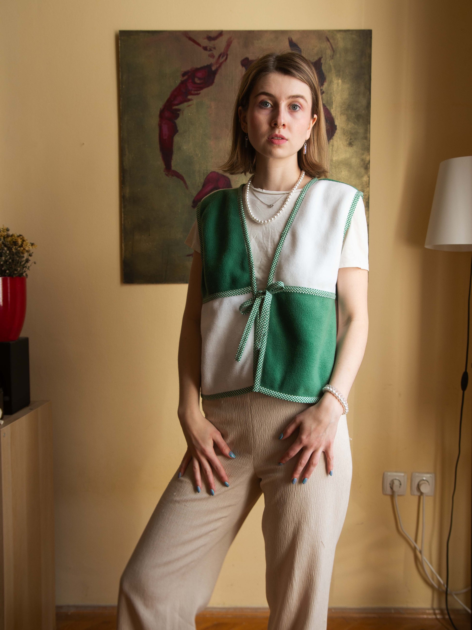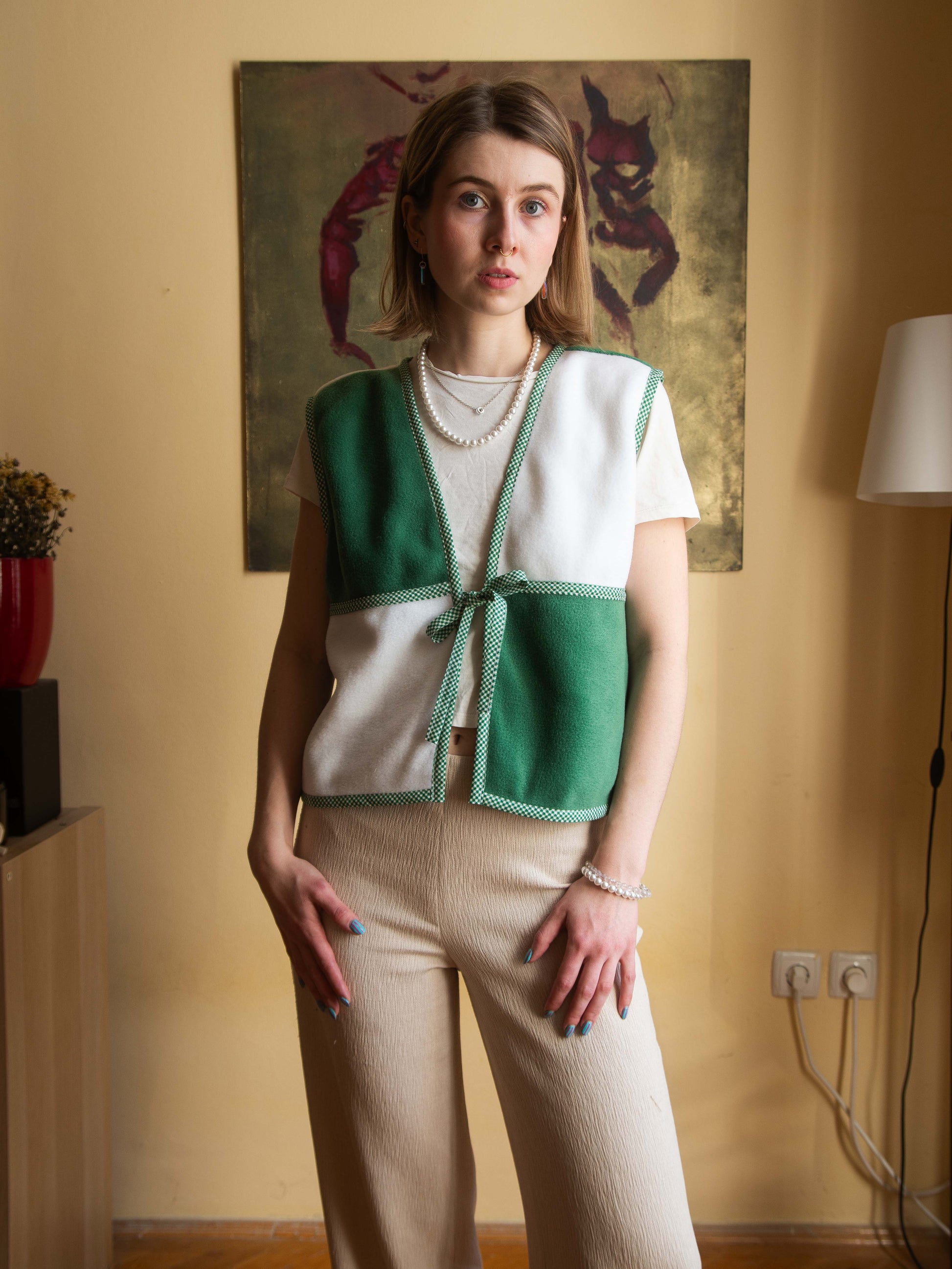 Szabászati maradékból készült, ujjatlan, masnis megkötős. Tökéletes választás egy egyszerű szett feldobásához, laza szabásának köszönhetően pedig igazán kényelmes darab.